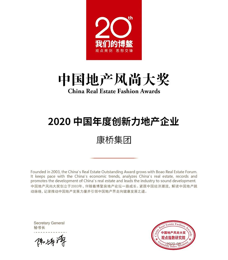 △ 康橋集團榮膺“2020中國年度創(chuàng)新力地產(chǎn)企業(yè)” 作為中國房地產(chǎn)業(yè)界頂級年度盛典,中國地產(chǎn)風尚大獎伴隨博鰲房地產(chǎn)論壇一路成長,見證行業(yè)發(fā)展,樹立企業(yè)力量。憑借突出的創(chuàng)新與研發(fā)能力,康橋集團成功入選本屆“中國地產(chǎn)風尚大獎”年度影響力榜單,榮膺“2020中國年度創(chuàng)新力地產(chǎn)企業(yè)”,再次彰顯了康橋集團強大的綜合實力和創(chuàng)新力。