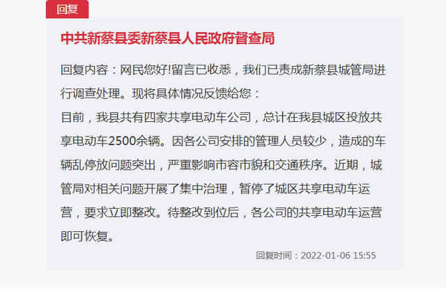 1月6日,新蔡縣對此公開回復(fù):我們已責(zé)成新蔡縣城管局進行調(diào)查處理?,F(xiàn)在將具體情況反饋給您: 目前,我縣共有四家共享電動車公司,總計在我縣城區(qū)投放共享電動車2500余輛。因各公司安排的管理人員較少,造成的車輛亂停放問題突出,嚴(yán)重影響市容市貌和交通秩序。近期,城管局對相關(guān)問題開展了集中治理,暫停了城區(qū)共享電動車運營,要求立即整改。待整改到位后,各公司的共享電動車運營即可恢復(fù)。 新時代消費網(wǎng)溫馨提示:當(dāng)您的合法權(quán)益受到侵害時,除了向行政機關(guān)投訴之外還可以通過新時代消費網(wǎng)“我要投訴”欄目及關(guān)注“新時代消費網(wǎng)”VX公眾號在快速投訴欄目進行在線投訴,我們將聯(lián)手消費者維權(quán)組織竭誠為您維權(quán)。(來源:新時代消費網(wǎng))