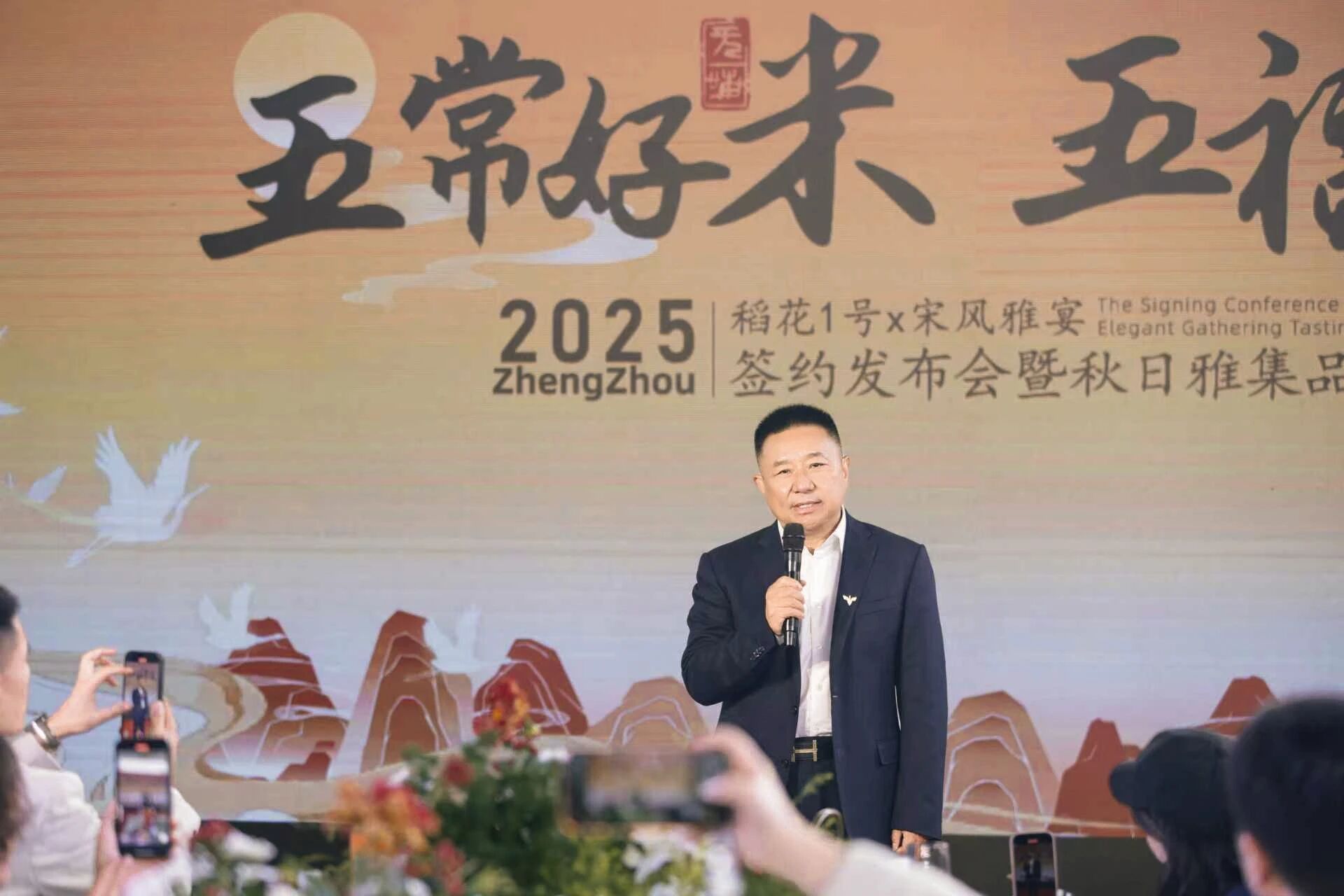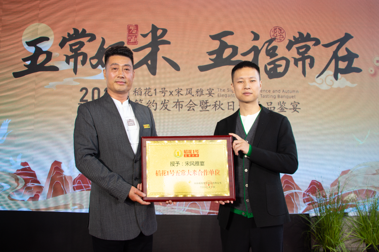 在雅樂氛圍烘托下,宋風雅宴品牌創(chuàng)始人成國富與稻花1號五常大米董事長苑金龍共同上臺,在合作簽約協(xié)議上鄭重簽字。這一筆,不僅是 “宋風雅宴”文化底蘊與“稻花1號”品質堅守的深度契合,更是宋風雅宴菜品品質升級的又一重要時刻。