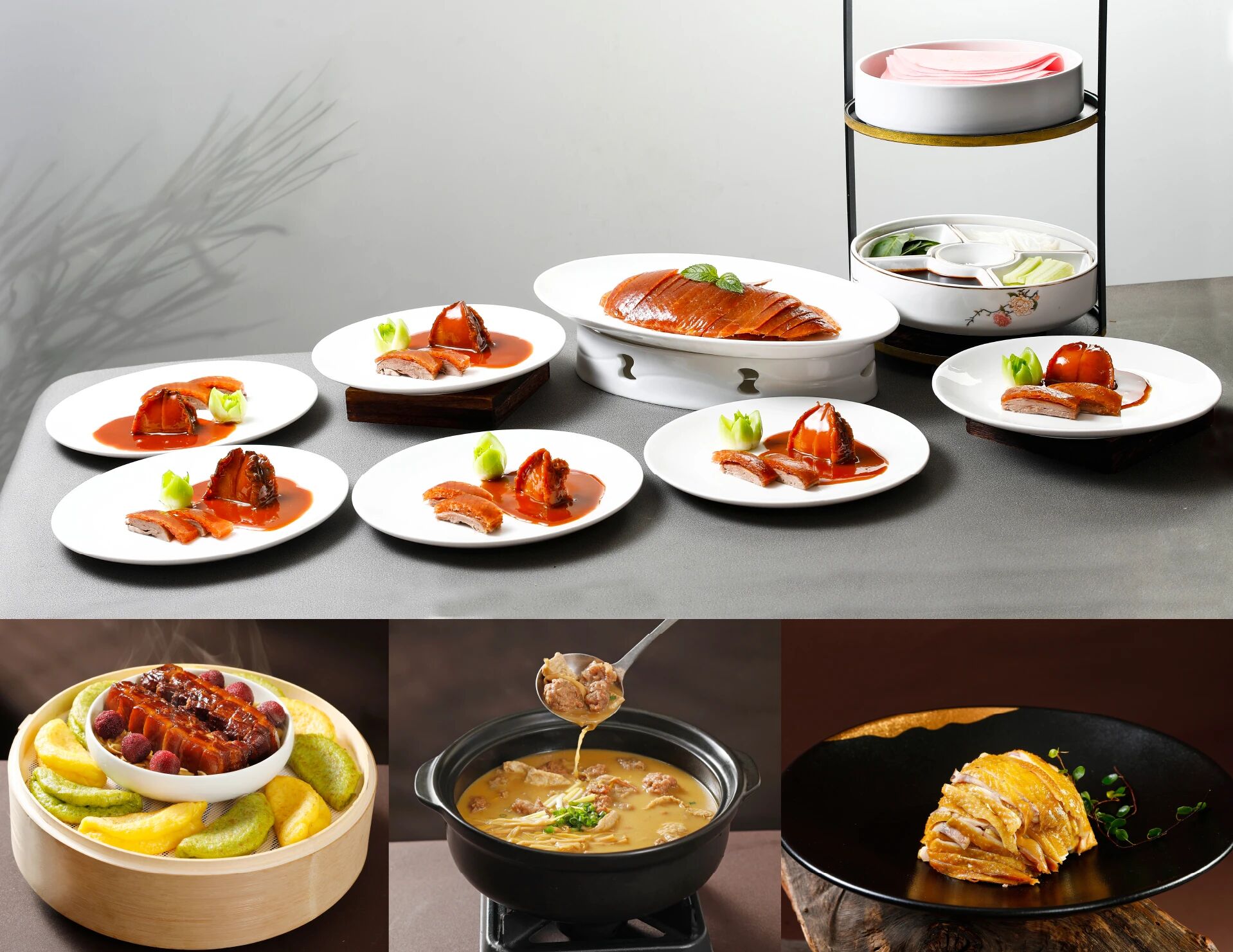 汴京鮑魚烤鴨是宋風雅宴的招牌菜品,《東京夢華錄》中記載的『汴京烤鴨』與宋時名貴食材鮑魚結合,精選上等填鴨,歷經3次選美,預冷排酸8小時,以新鄭棗木烤制90分鐘,出爐烤鴨周身棗紅,色澤誘人,脂香濃烈,再配以秘汁燒制的鮑魚食用,重現(xiàn)宋時汴京風華。