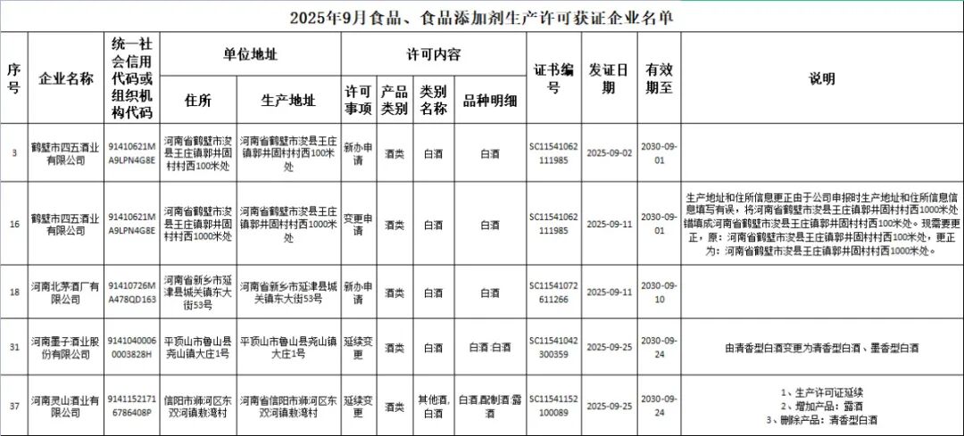從河南省市場(chǎng)監(jiān)督管理局10月20日發(fā)布的2025年9月市場(chǎng)監(jiān)督管理行政許可獲證單位名單公告中可以看出,共有4家白酒企業(yè)獲頒食品生產(chǎn)許可證,分別是(按公布順序排序、表格形態(tài)有修改,內(nèi)容未變):