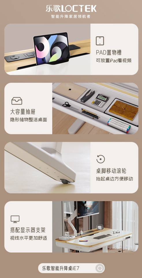 科技創(chuàng)新讓產(chǎn)品更有品質。樂歌智能升降桌iE7系列采用樂歌自主研發(fā)的雙電機,強勁驅動,讓書桌升降速度更快的同時還能實現(xiàn)高穩(wěn)定性和超靜音效果。自帶的無線充電功能滿足手機即放即充,還配置有電源管理系統(tǒng),整桌僅需一根電源線,內(nèi)嵌式排插滿足護眼燈、學習機、打 印機等電子學習用品的用電需求。超大承重量可以滿足不同人群的多重需求,站著打字桌面也不會晃動,用科技打造高品質的辦公、學習環(huán)境。