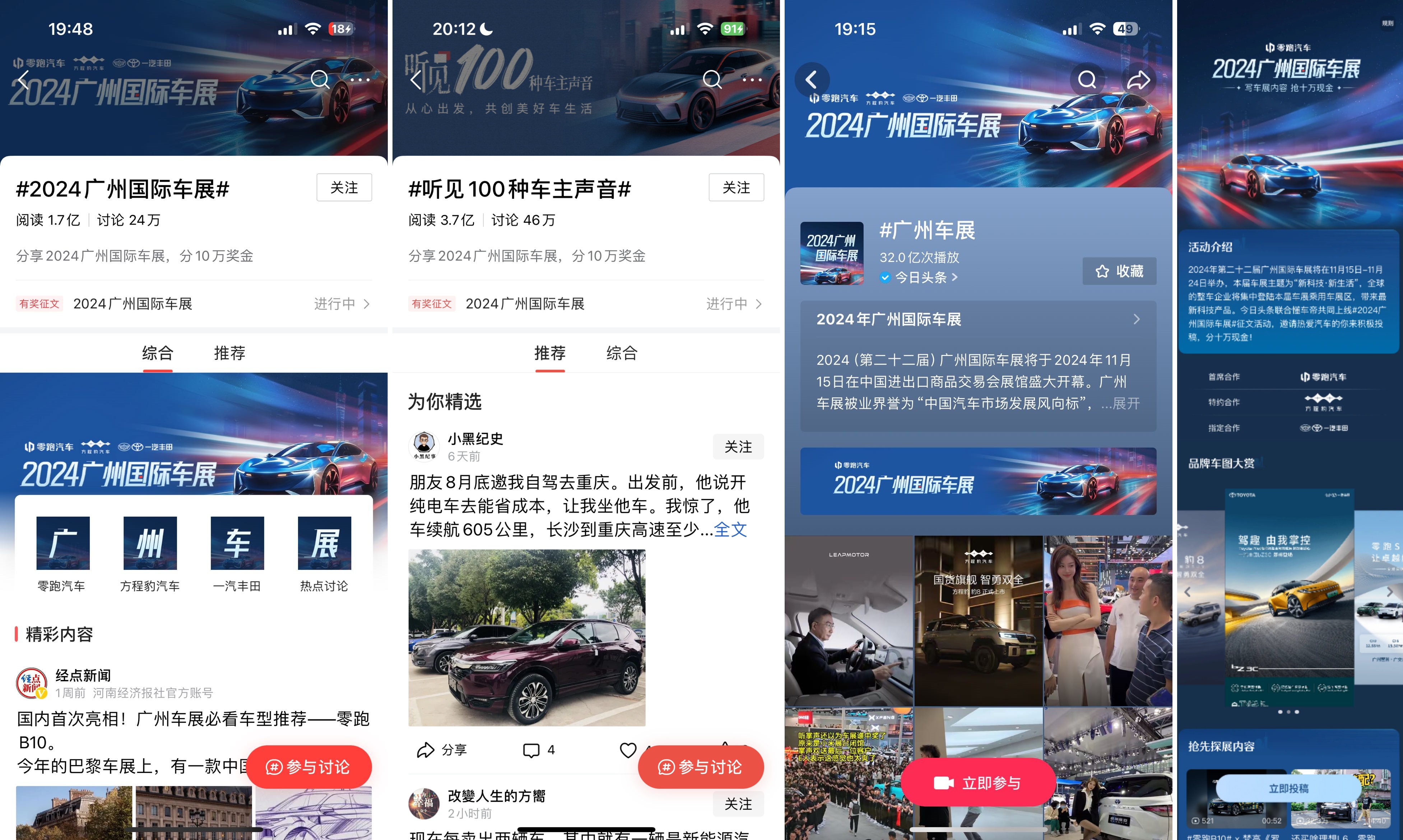 為進(jìn)一步提升觀展體驗(yàn),在廣州車展期間,今日頭條聯(lián)合抖音攜手全網(wǎng)跨界多領(lǐng)域SKOL打造“2024廣州車展頭條達(dá)人觀展團(tuán)”,通過(guò)駐場(chǎng)直播、視頻、圖文、微頭條“全體裁”等方式,深度探訪年底最重磅車展,高效高質(zhì)提供廣州車展熱點(diǎn)信息。與此同時(shí),今日頭條通過(guò)官方話題、「聽見100種車主聲音」汽車品類IP活動(dòng)等多元化玩法,全方位借勢(shì)車展大事件,助力品牌新車驚艷亮相,花式種草強(qiáng)化潛在消費(fèi)群體心智。