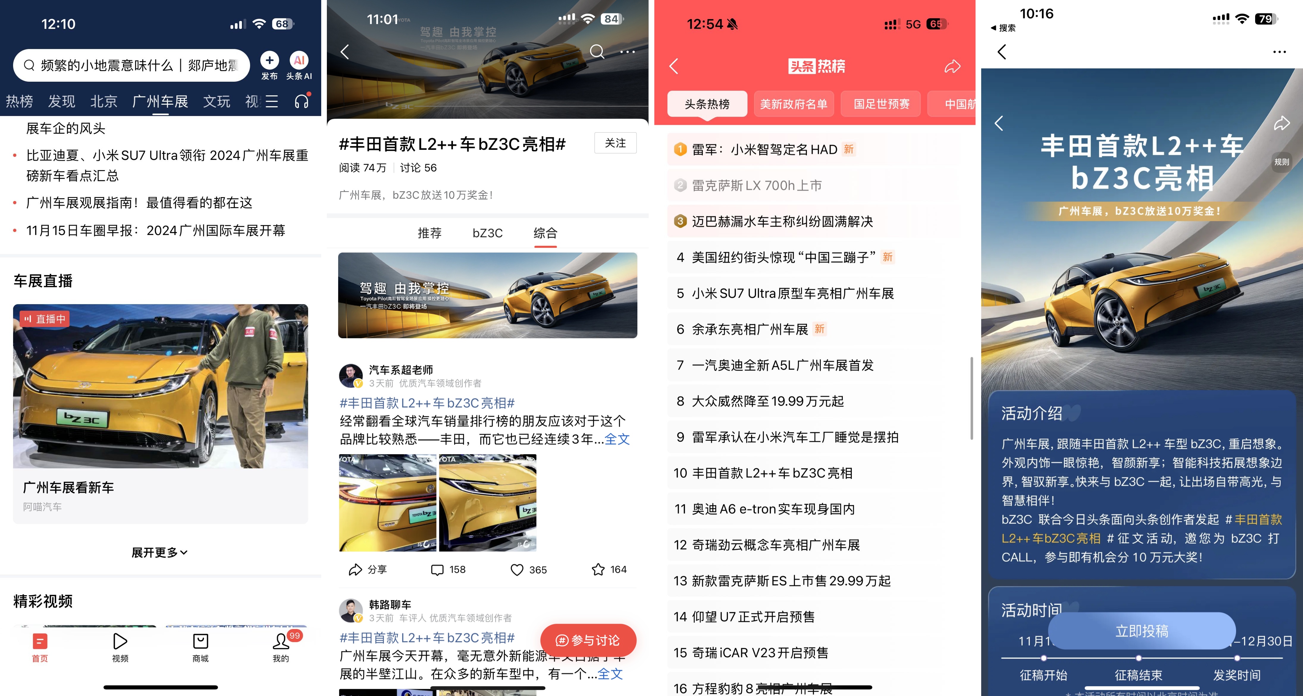 活動(dòng)期間,今日頭條還為車企品牌定制了達(dá)人合作、定制話題、原生熱點(diǎn)等花樣玩法,其中一汽豐田品牌相關(guān)話題#豐田首款L2++車bZ3C亮相 登陸頭條總榜TOP30,汽車榜TOP1。此外,今日頭條針對(duì)一汽豐田bZ3C、方程豹 豹8、零跑B10等新款熱門車型量身打造一系列互動(dòng)玩法,圍繞安全性、智駕系統(tǒng)、舒適性等主題方向激發(fā)全民討論熱情,多元內(nèi)容擊穿營(yíng)銷壁壘,助力品牌新車破圈。