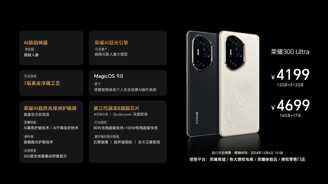榮耀300系列現(xiàn)已開售!其中榮耀300共有8GB+256GB、12GB+256GB、12GB+512GB、16GB+512GB四種配置,全渠道起售價(jià)格2299元;榮耀300 Pro共有12GB+256GB、12GB+512GB、16GB+512GB三種配置,起售價(jià)3399元;榮耀300 Ultra共有12GB+512GB、16GB+1TB兩種配置,起售價(jià)格4199元。