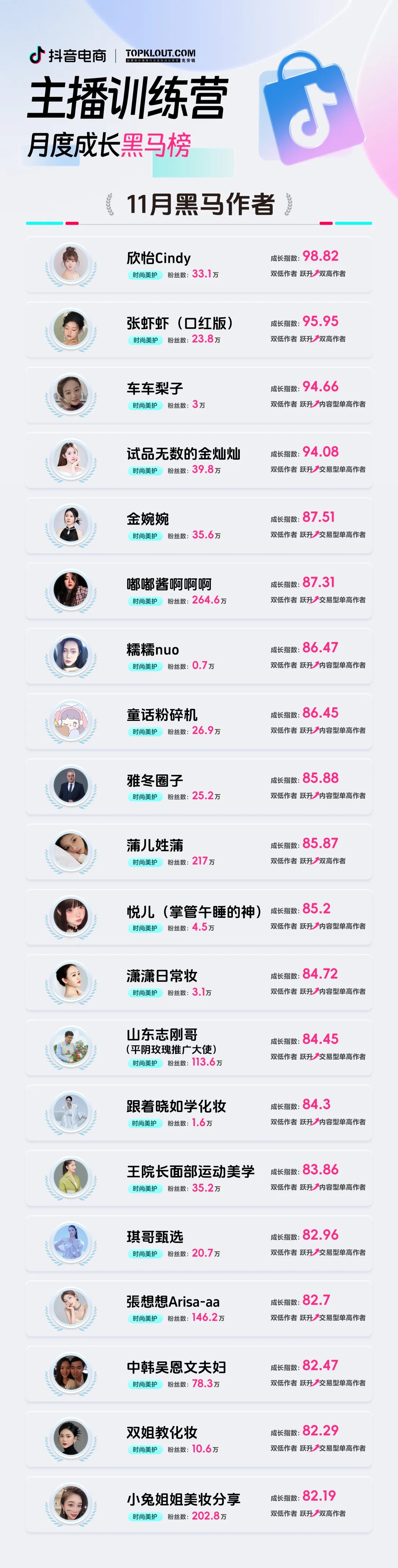 本期榜單雖然只聚焦美妝這一條賽道,但同樣涌現(xiàn)出20名風(fēng)格不同的月度黑馬作者: