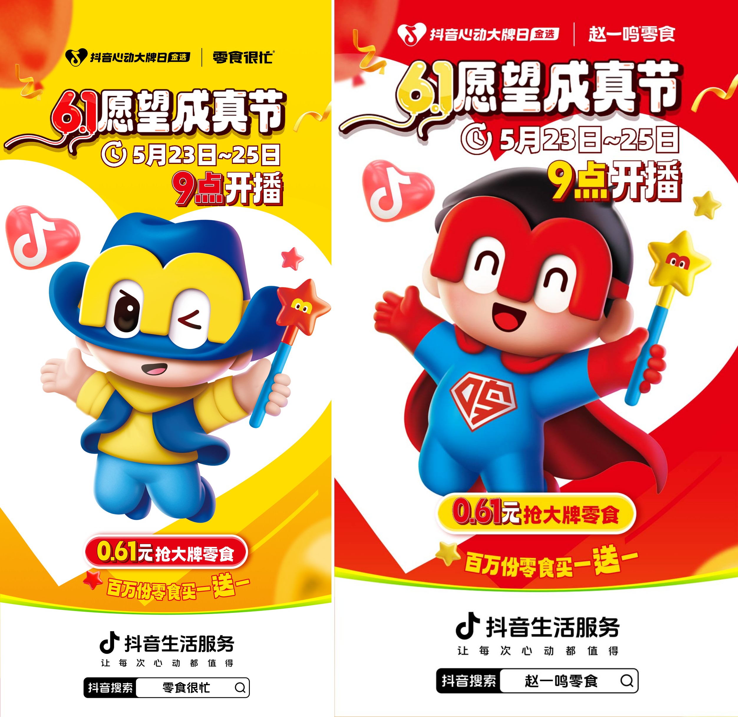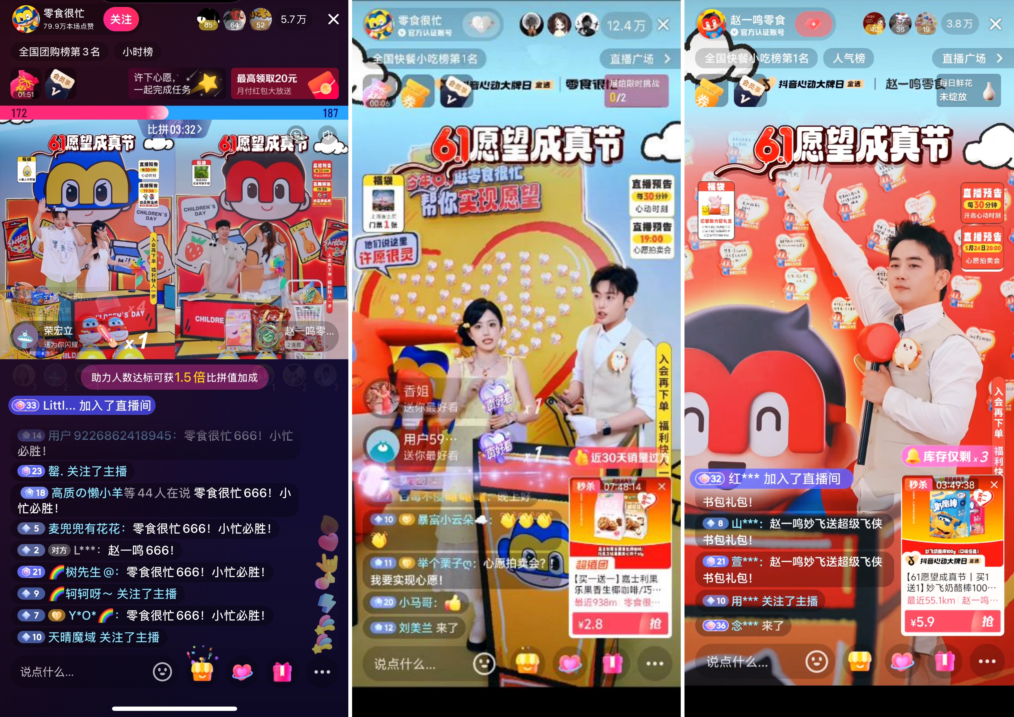 為了響應(yīng)這份全民快樂心愿,鳴鳴很忙集團(tuán)(零食很忙、趙一鳴)重磅攜手「抖音心動(dòng)大牌日」,傾力打造了盛大的“61愿望成真節(jié)”。品牌集結(jié)哆啦A夢(mèng)、蠟筆小新、旺仔、小豬佩奇等五大IP,推出聯(lián)名定制零食,引發(fā)集體共鳴;更在輕綜藝化的創(chuàng)新直播間內(nèi),加碼“百萬份零食買一送一”鉅惠與0.61元秒殺驚喜,創(chuàng)意融入“雙品牌連線PK互動(dòng)”、“心愿拍賣會(huì)”等強(qiáng)互動(dòng)玩法,讓大家共赴了一場(chǎng)滿載童趣與驚喜的無憂之旅。