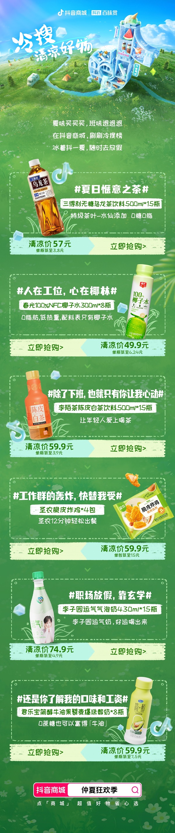 為幫助年輕人從熱燥的氣溫和悶乏無味的工作氛圍中抽離,盡情享受夏日的輕松與愉悅,抖音商城特別提出“成年人可借一杯冰飲、一口冰棍、一頓夜宵,就能過一個最小單位假期”的夏日主張,幫助大家從冰飲夜宵中汲取快樂養(yǎng)分,擊退班味與乏味,輕松度夏。