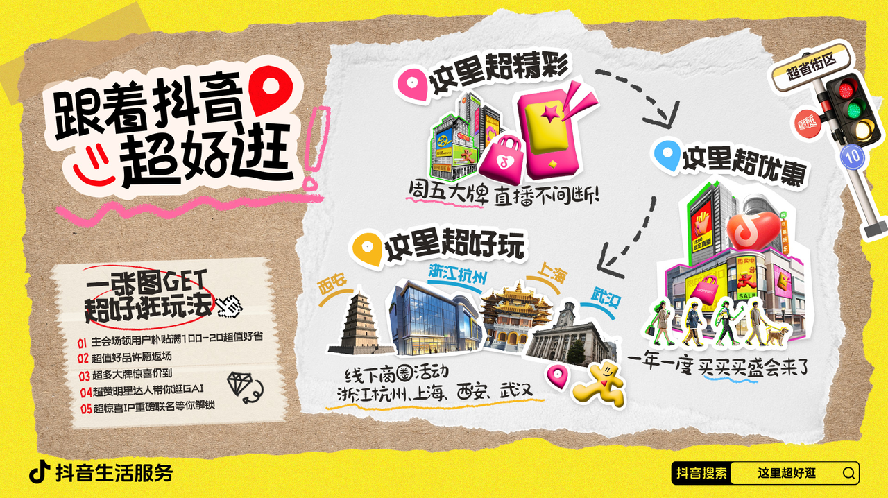 你有多久沒有逛街了? 在周五下班的路上 落日還在車窗上搖晃 晚風微涼 與好友相約老地方 華燈初上,櫥窗明亮 人潮南來北往 或是在抖音團購開逛 隨心徜徉 喚醒沉睡味蕾 切換慵懶周末 從金秋到隆冬,越來越多的市民游客跟著抖音生活服務“超好逛”,共赴一場城市游玩狂歡。兩個月超chill的逛街之旅,給忙碌的疲憊身心“放個假”。這就是抖音生活服務推出的區(qū)域商圈IP營銷活動——「抖音超好逛」,在線上線下打造出獨具特色的超好逛“微度假”模式?;顒踊ㄊ铰?lián)動政府、明星、IP等種草抖音超好逛的生活方式,掀起“跟著抖音超好逛”的用戶消費新潮流。