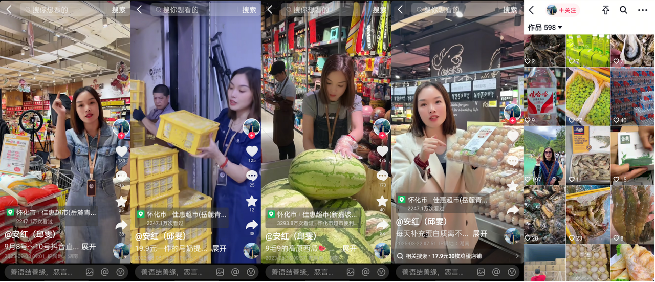 而這一切都始于一場“試水”。2023 年初,當(dāng)時佳惠處于線下人流量增幅不大的經(jīng)營瓶頸期,抖音平臺上店員開直播、做短視頻的畫面吸引了安紅,這種低成本高效率的玩法,讓她看到了有嘗試的前景,至此,安紅就先用個人賬號下場測試,開啟了關(guān)于職人模式的探索。