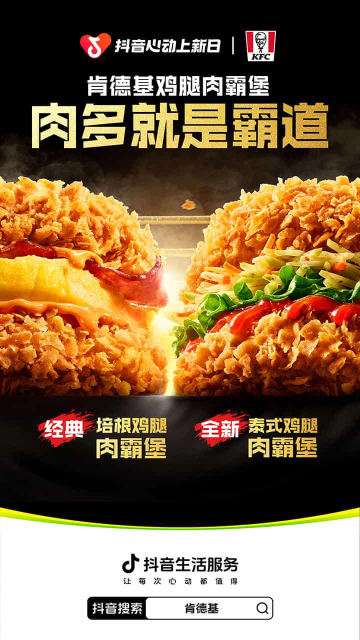 肯德基為回饋廣大粉絲的熱情支持,特別打造了一場“肯德基肉霸堡-放縱吃肉 重磅享受”福利回饋活動,并于3月1日至3月14日聯(lián)動“抖音心動上新日”重磅推出“肉霸堡”系列新品:培根雞腿經(jīng)典風味選用濃香煙熏培根與整片爆汁菠蘿,還有全新升級的泰式雞腿口味,超大雞腿排搭配青木瓜配菜,整體口感更清爽更解膩,僅需29.9元即可嘗鮮兩堡美味。在肯德基品牌官方直播間,除了為粉絲準備的肉霸堡豪華三人餐和滿足雙人餐,讓大家盡情享受大口吃肉的樂趣外,足足13件的經(jīng)典超值全家桶也將重磅回歸,在直播間提前囤購即可輕松享受特惠補貼價。肯德基在三月開春時節(jié),依托“新品首發(fā)+爆款回歸”的雙重策略,以超值價格讓消費者們“美美嘗鮮”,在助力新品吸引年輕群體目光、引爆市場的同時,也為品牌促成了一波生意銷量的顯著提升。