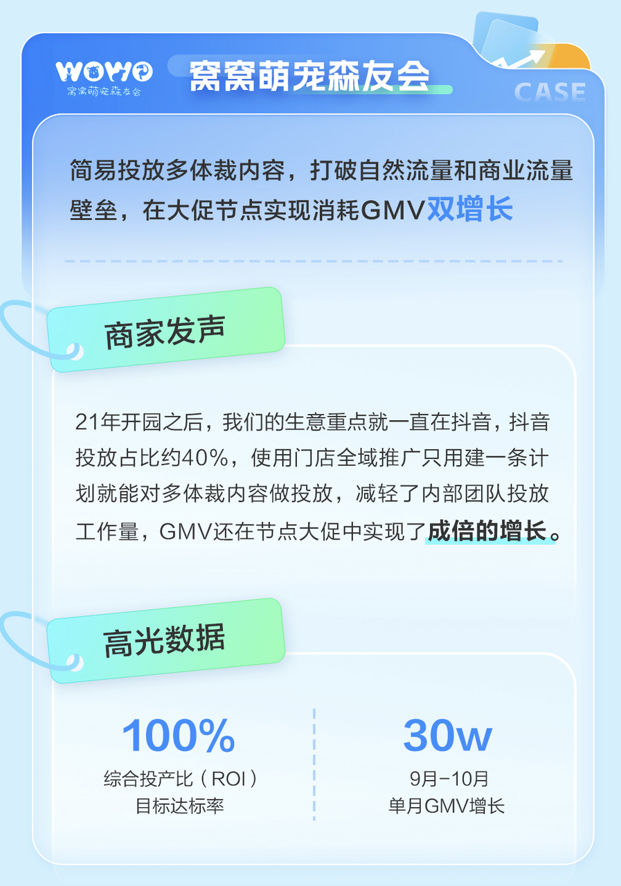 生意一直聚焦在抖音平臺的窩窩萌寵森友就是一個典型案例,在使用「門店全域推廣」后,只建一條計劃就完成了多體裁內(nèi)容的投放,大大減輕了內(nèi)部團(tuán)隊投放工作量,同時單月GMV增長達(dá)到30萬。