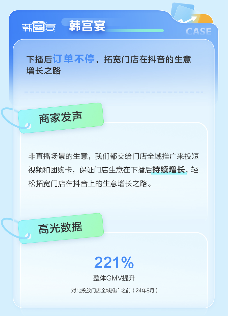 「門店全域推廣」為商家提供直播以外的第二條生意增長曲線,直播商家即使下線,依然可以訂單不停;非直播商家不做直播也能獲取新的生意增量。近年,韓宮宴在直播業(yè)務(wù)的推動下生意增速顯著,但依然想探索全新增量,于是決定開啟「門店全域推廣」,使用產(chǎn)品后,其整體GMV提升221%,成功破解了直播外的增長難題。