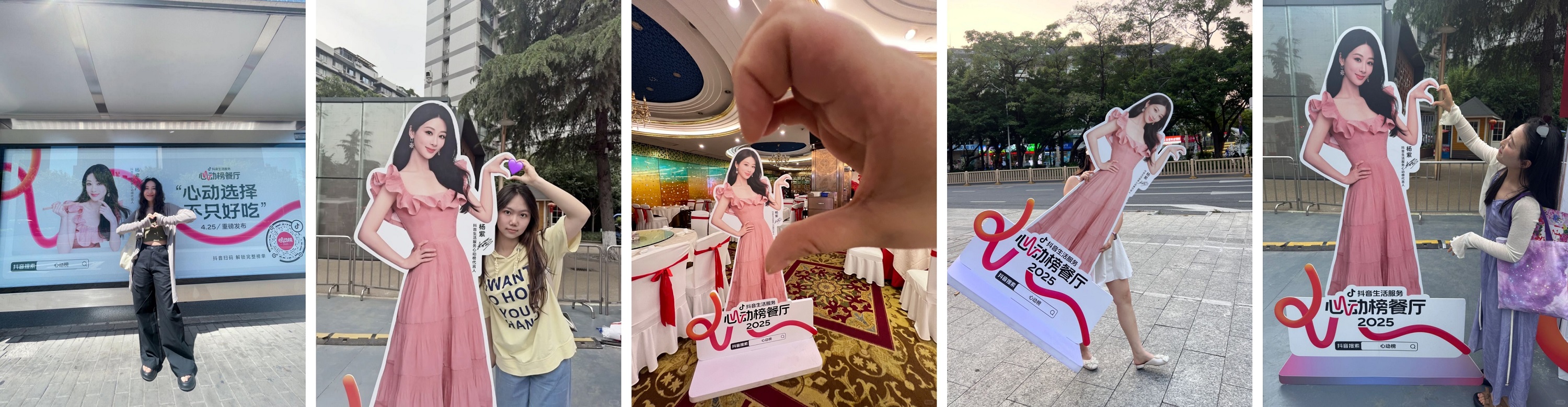 在多方的共同拱熱下,享受假期的游客們陸續(xù)上線,將這場狂歡推向頂峰。當他們手握“心動榜”穿行城市街頭,選餐廳早已超越味蕾需求——在廣東,有人驚喜表示“官宣第二天就去了心動榜推薦的附近意式餐廳,竟意外的好吃”;在青島,大學(xué)生們組團挑戰(zhàn)“用心動舞動作解鎖隱藏菜單”;在長沙,某餐廳因“老板允許食客在墻上寫情書”被網(wǎng)友稱為“賽博月老廟”,在浙江的網(wǎng)友說“心動榜早就巡吃過一次啦”……最終讓#五一全國巡吃計劃# #楊紫巡吃到哪了# 等話題曝光量累計近10億。