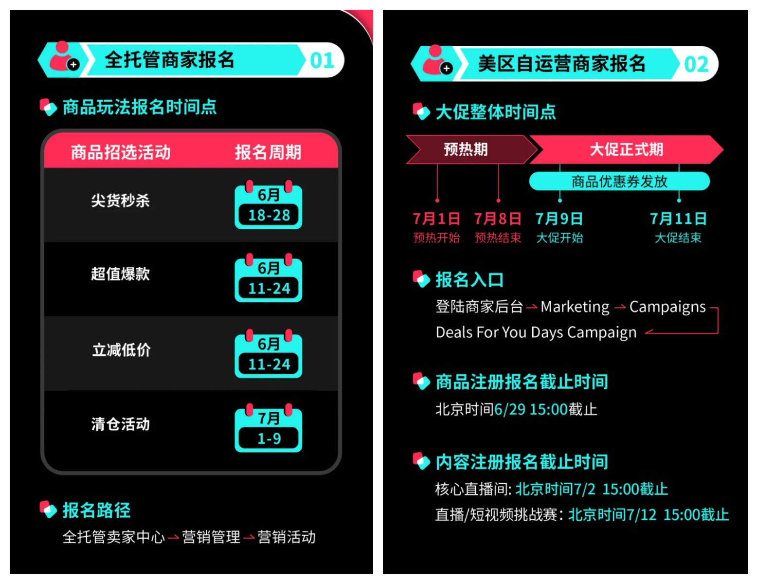 TikTok Shop發(fā)布的時(shí)間表顯示,全托管商家可在6月11日起報(bào)名超值爆款、尖貨秒殺、立減低價(jià)、清倉活動(dòng)等商品招選活動(dòng)。POP自運(yùn)營商家則需在6月29日前完成商品注冊報(bào)名。