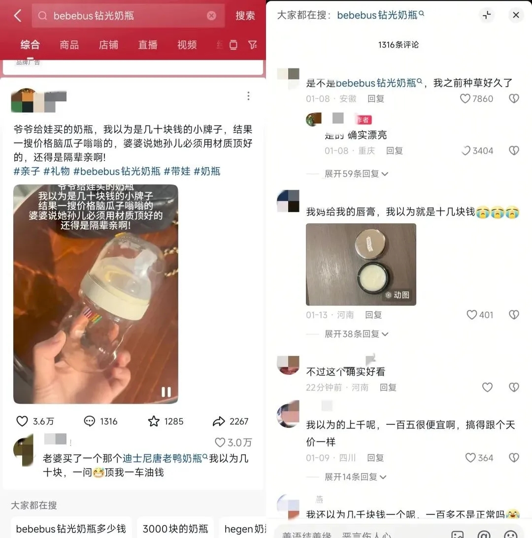 在抖音搜索“隔輩親”這個(gè)話題,我們會(huì)發(fā)現(xiàn)大量視頻都吸引了用戶的點(diǎn)贊評(píng)論。其中就有一條“爺爺買(mǎi)回來(lái)的奶瓶,還以為是幾十塊錢(qián)的小牌子,結(jié)果一搜價(jià)格腦瓜子嗡嗡的”,這種反差感極強(qiáng)的話題引發(fā)了網(wǎng)友激烈的討論,也讓相關(guān)內(nèi)容爆火,為品牌提供了充足的討論、搜索熱度。
