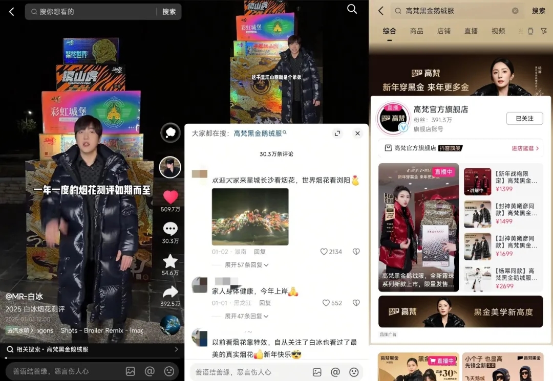 知名羽絨服品牌高梵就在2025年開(kāi)年之際與超頭部達(dá)人@MR-白冰 展開(kāi)合作,并借助煙花測(cè)評(píng)和新年祈福的議題打造,用高質(zhì)量的短視頻吸引了大量用戶點(diǎn)贊、圍觀。目前該條視頻的點(diǎn)贊量超過(guò)500萬(wàn),同時(shí)還引發(fā)了30多萬(wàn)條評(píng)論、近55萬(wàn)個(gè)收藏,轉(zhuǎn)發(fā)分享即將突破400萬(wàn)次。