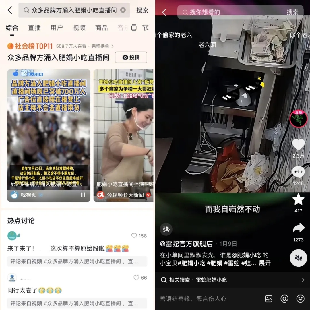 2024年年底,“因愛(ài)重生”的肥娟小吃店無(wú)意間登上熱搜,瞬間成為熱議的焦點(diǎn)。心細(xì)的網(wǎng)友發(fā)現(xiàn),肥娟小吃店的角落里竟然有一只雷蛇鼠標(biāo)。雷蛇當(dāng)然不會(huì)錯(cuò)過(guò)這個(gè)熱度,官方直接下場(chǎng)在@肥娟小吃 直播間狂刷禮物,并在評(píng)論區(qū)互動(dòng)提升熱度,吸引大量網(wǎng)友圍觀、討論。