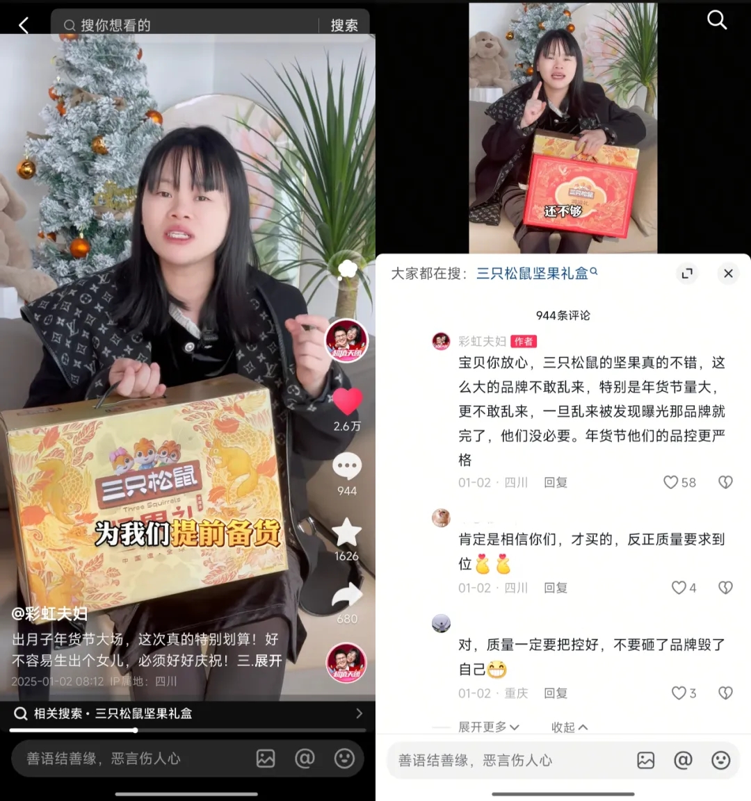 與高梵選擇頭部達(dá)人聯(lián)動(dòng)不同,三只松鼠在年貨節(jié)期間則與@彩虹夫婦 @特別烏啦啦 @丁佳偉 等27位達(dá)人展開(kāi)矩陣式合作。因?yàn)閳?jiān)果禮盒的客單價(jià)更低,需要觸達(dá)的用戶群體比羽絨服更龐大,聯(lián)動(dòng)大量達(dá)人有助于三只松鼠觸達(dá)更大范圍、更多元的群體。