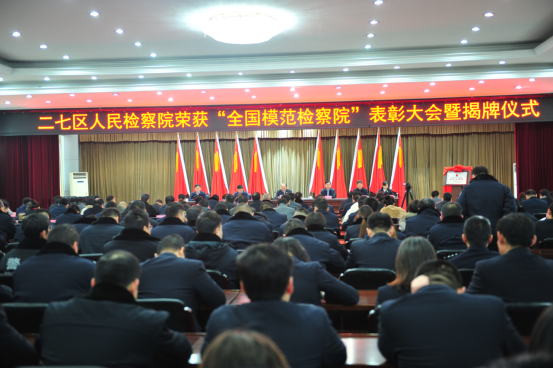 會上,鄭州市檢察院黨組成員、政治部主任丁力,市委政法委副書記、綜治辦主任李華云,分別宣讀了表彰決定。鄭州市檢察院黨組書記、檢察長劉海奎,二七區(qū)委副書記、區(qū)長蘇建設共同為“全國模范檢察院”揭牌。