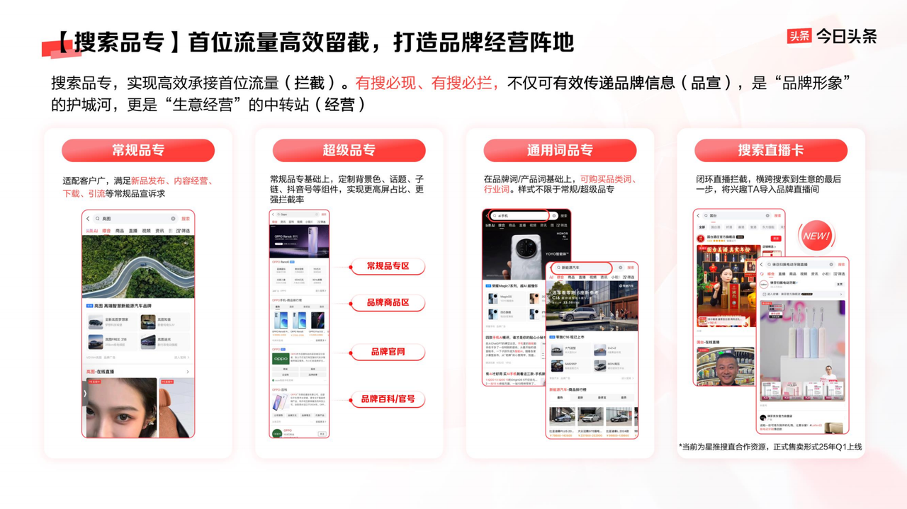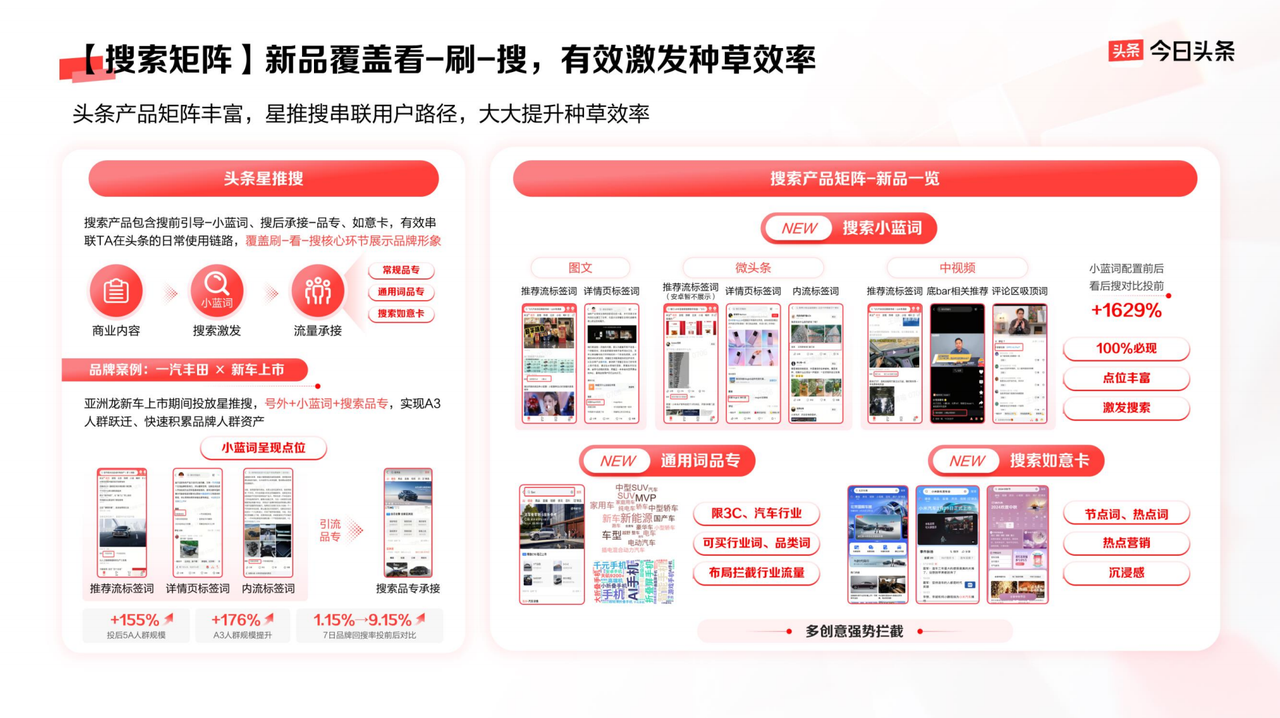 │多元產(chǎn)品力:品牌傳播全場景覆蓋,矩陣式打造種草閉環(huán) 值得注意的是,今日頭條多元創(chuàng)新的產(chǎn)品矩陣也成為品牌營銷講故事、拓場景、訴情緒的價值護城河。從“黃金曝光點位”、“品牌互動體驗”到“產(chǎn)品價值引流”、“搜索高效種草”,既高效通連,又各有所長,通過在實踐中靈活組合,便能為品牌帶來高效率的閉環(huán)轉(zhuǎn)化。