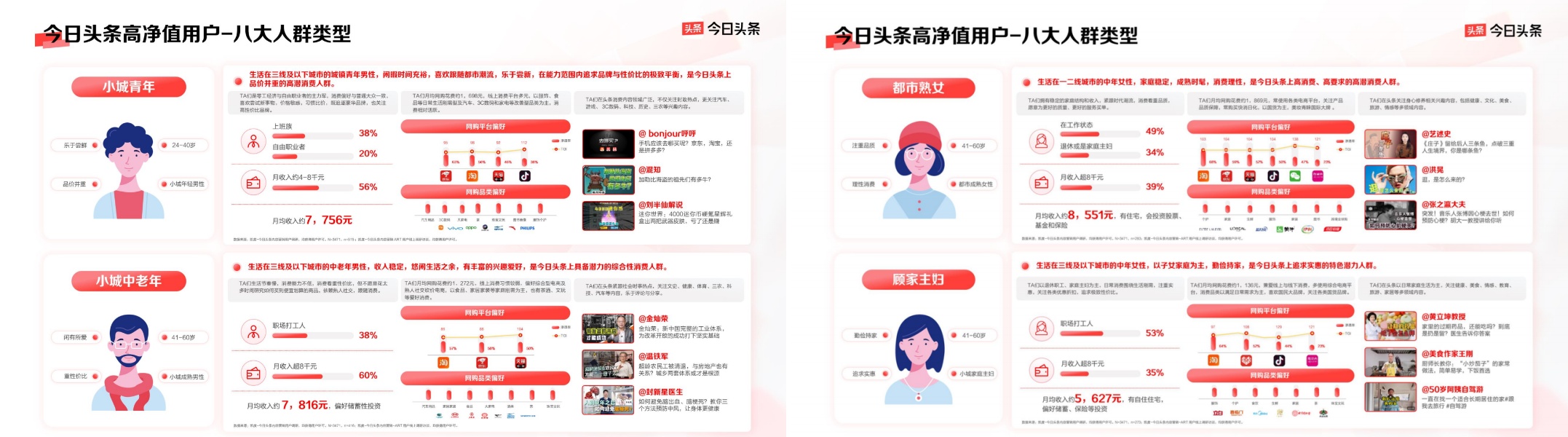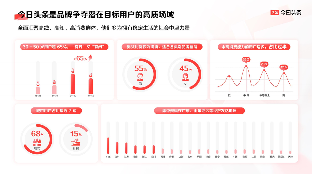 在億級體量優(yōu)勢基礎(chǔ)上,今日頭條用戶的高價值特點也十分明顯?;趶娏业馁Y訊和熱點認知,今日頭條聚集了以都市中產(chǎn)、新晉打工人、小城青年、小城中老年、精英白領(lǐng)、品質(zhì)寶媽、都市熟女、顧家主婦為主的八大高凈值用戶類型,覆蓋性別均衡、地域廣泛、興趣多元、消費力強勁的多元用戶圈層。