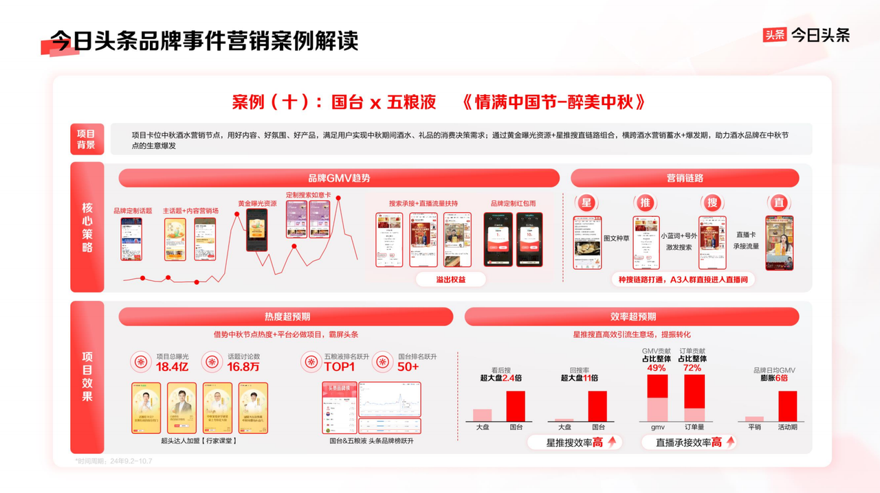 接下來,如何助力品牌節(jié)點生意爆發(fā)?今日頭條選擇以“黃金曝光資源+星推搜直鏈路”組合,高效引流品牌生意場,打造“種-搜-拔”的轉(zhuǎn)化閉環(huán),有效縮短決策鏈路,讓用戶消費路徑更絲滑順暢,品牌日均GMV膨脹6倍,GMV貢獻占比整體49%。