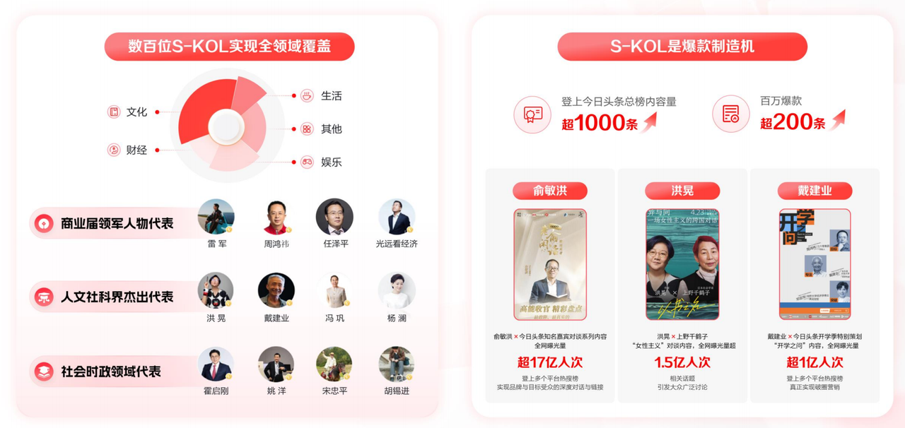 圖源:《2024今日頭條平臺(tái)營(yíng)銷通案》 其次,今日頭條作者與內(nèi)容負(fù)責(zé)人李黎也表示,截至目前有近10萬(wàn)各行各業(yè)專家和萬(wàn)余家新聞媒體機(jī)構(gòu),持續(xù)活躍在頭條。平臺(tái)上如俞敏洪、洪晃等不少社會(huì)名人和權(quán)威媒體,也共同構(gòu)建著這個(gè)具有公信力的輿論場(chǎng)。這樣的環(huán)境對(duì)品牌而言是寶貴的借勢(shì)機(jī)會(huì),只需融入其中,品牌便能獲得顯著的影響力提升與公信力加強(qiáng),從而實(shí)現(xiàn)品牌形象的全面升級(jí)。