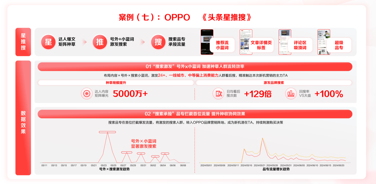 OPPO就是個(gè)典型案例,此前品牌在運(yùn)用“星推搜”這個(gè)營(yíng)銷策略,搜索就發(fā)揮了重要作用。品牌先與達(dá)人合作輸出內(nèi)容(即“星”),而后展開(kāi)內(nèi)容推廣(即“推”),并在內(nèi)容中設(shè)置搜索小藍(lán)詞(必現(xiàn))、評(píng)論區(qū)吸頂詞等等,成功吸引用戶在閱讀后直接點(diǎn)擊搜索,品牌的日均看后搜次數(shù)也因此增長(zhǎng)129倍,品牌曝光度顯著提升。同時(shí),OPPO還設(shè)置了搜索品專,有效攔截并承接了搜索流量,將被激發(fā)的搜索人群高效引入品牌自有陣地,從而帶動(dòng)轉(zhuǎn)化和留存。