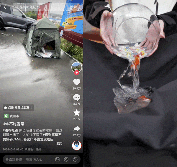 被情懷觸動(dòng)的網(wǎng)友們迅速找到背包背后的品牌祥興箱包,自發(fā)前往評(píng)論區(qū),想要購買同款,#全網(wǎng)都在尋找北京奧運(yùn)會(huì)同款背包 的話題 2 小時(shí)就沖上種草榜 TOP2。盡管早已停止運(yùn)營一年,但聞風(fēng)而動(dòng)的祥興箱包沒有錯(cuò)過這一熱點(diǎn),火速下場(chǎng)直播,抓住了這股熱度,場(chǎng)均銷售額達(dá)百萬以上。 坦率地講,對(duì)品牌而言,諸如祥興箱包這樣的「潑天熱點(diǎn)」可遇不可求,更重要的還是充分與大眾浸潤在同樣的娛樂語境和文化土壤中:跑贏大眾洞察,及時(shí)將熱點(diǎn)轉(zhuǎn)化為營銷的機(jī)會(huì)點(diǎn)。 今年 6 月,有抖音用戶曬出了一段「漂流」奇遇:自己在外搭帳篷過夜,突遇大雨漲水,絲毫沒有進(jìn)水的帳篷竟然漂浮在水上了。因?yàn)樾Ч^直觀,相關(guān)話題開始發(fā)酵,突發(fā)熱點(diǎn) #第一次見這么防水的帳篷 登上種草榜 TOP 8,帳篷的品牌方駱駝火速下場(chǎng)認(rèn)領(lǐng)了這一話題,與用戶熱情互動(dòng),同時(shí)品牌直播間也及時(shí)跟進(jìn)熱點(diǎn),現(xiàn)場(chǎng)演繹「帳篷養(yǎng)魚」,再現(xiàn)硬核防水功能。