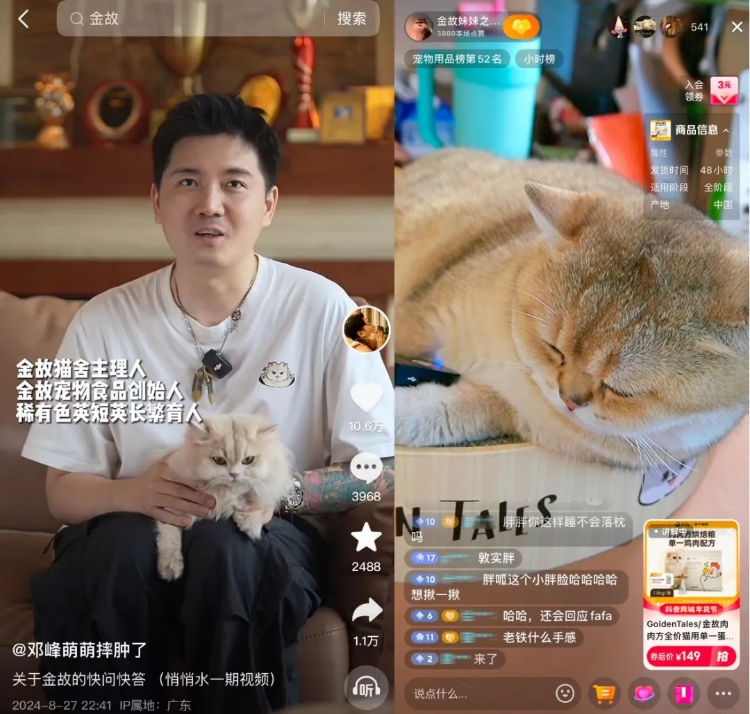 世界不能沒有小貓小狗。年輕人悅己滿足的自我關(guān)懷,也體現(xiàn)在為自己找個(gè)「萌寵搭子」上。 如今萌寵已成為年輕人逃離社交壓力、療愈孤獨(dú)情緒的情感寄托。加班卷不動(dòng)了?回家擼個(gè)小貓小狗,立馬就能獲得滿滿的情緒價(jià)值,哪怕云吸一下也可以。 甚至,區(qū)別于上一代的養(yǎng)寵觀念,年輕人越來越將寵物視作家庭成員,寧可窮自己,也不愿意窮毛孩子,對(duì)愛寵傾注了大量的精力和財(cái)力。當(dāng)「育兒式養(yǎng)寵」興起,從寵物智能用品、定制零食到寵物健康保險(xiǎn)和醫(yī)療服務(wù),養(yǎng)寵消費(fèi)從基本需求拓展到毛孩子的衣食住行方方面面,需求日趨精細(xì)化和高端化。 萌寵博主鄧峰(@鄧峰萌萌摔腫了)創(chuàng)辦的寵物食品品牌金故 Golden Tales,就成功抓住用戶對(duì)于萌寵的情感需求,搭乘抖音電商的東風(fēng),通過優(yōu)質(zhì)內(nèi)容撬動(dòng)了電商轉(zhuǎn)化。 很多人是通過萌寵短視頻認(rèn)識(shí)鄧峰、了解到金故這個(gè)品牌的。起初,鄧峰只是在抖音上分享自家貓舍的相關(guān)內(nèi)容,依靠全透明公開貓舍飼養(yǎng)環(huán)境,吸引了大量粉絲的關(guān)注。為了解決貓舍貓咪的飲食問題,鄧峰和團(tuán)隊(duì)開始嘗試自制生骨肉和凍干,而這也是金故創(chuàng)立品牌的起點(diǎn)。 金故從 2023 年開始布局抖音電商,通過短視頻和直播間真誠記錄自家小貓成長(zhǎng)日常。鄧峰每周日會(huì)與粉絲直播聊天分享貓咪近況,巧妙地讓自家貓咪成為自家產(chǎn)品的「實(shí)驗(yàn)官」,展示小貓吃飯撒嬌的萌態(tài)。粉絲進(jìn)到直播間一邊「云吸貓」,一邊就會(huì)忍不住為自家的毛孩子下單。目前,鄧峰在全網(wǎng)成為擁有千萬粉絲的萌寵頂流博主,金故品牌的全網(wǎng)銷售額也已破億。
