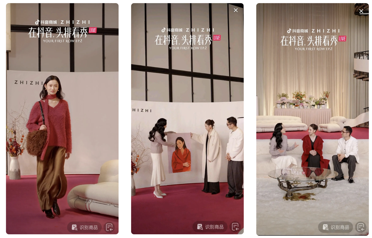 拉夫勞倫是如何通過強(qiáng)化品牌與「老錢風(fēng)」心智的綁定,進(jìn)而轉(zhuǎn)化成銷量爆發(fā)的呢?從去年年末品牌在抖音電商的雙 11 新品首發(fā)營銷中,我們或許可以窺見一二。 秋冬上新是服飾品牌不容錯(cuò)過的季節(jié)性熱點(diǎn),緊跟這一熱點(diǎn),拉夫勞倫此次在預(yù)售環(huán)節(jié)就開始在內(nèi)容上發(fā)力。借勢(shì) #氛圍感大衣才是冬天新品主場(chǎng) 這一站內(nèi)趨勢(shì)話題的熱度,品牌與大量短視頻達(dá)人合作,發(fā)布以「雅丹老錢風(fēng)穿搭」為趨勢(shì)關(guān)鍵詞的種草內(nèi)容,進(jìn)一步激活用戶討論聲量,成功為直播專場(chǎng)造勢(shì)、蓄力。 而后,以種草視頻作為引流,品牌借助「拉夫勞倫老錢風(fēng)」小藍(lán)詞看后搜,以及作者首評(píng)引導(dǎo)跳轉(zhuǎn)商城功能,完成了從種草到購買的絲滑銜接。最終品牌也帶來了商業(yè)轉(zhuǎn)化上的亮眼表現(xiàn),實(shí)現(xiàn)雙 11 正式期大場(chǎng)成交破紀(jì)錄。 同樣是乘勢(shì)潮流趨勢(shì),本土女裝品牌 ZHIZHI 致知?jiǎng)t乘上了「東方美學(xué)」的風(fēng),在越來越「卷」的服飾市場(chǎng)中,找到了屬于品牌自己的突圍之路。 前不久,ZHIZHI 致知開啟了一場(chǎng)冬季新品直播大秀,品牌基于東方美學(xué)的審美理念在新品中得到了集中展示,除了推出無重力羽絨服、創(chuàng)始人系列等融合傳統(tǒng)文化元素的特色貨品,品牌還將瑤花慢、滿江紅等古詩詞「詞牌名」嵌入商品名,充分詮釋了中式傳統(tǒng)文化的韻味。 此外更令人印象深刻的是,這次品牌將傳統(tǒng)秀場(chǎng)搬到了抖音直播間,整個(gè)秀場(chǎng)的陳設(shè)布置極具設(shè)計(jì)感,中國紅和柔和白的搭配,既突出了中式美學(xué)中傳統(tǒng)的節(jié)慶氛圍,同時(shí)兼具了生活化的隨性,讓人倍感溫馨親切。直播期間,還穿插了創(chuàng)始人、明星嘉賓、藝術(shù)總監(jiān)的對(duì)談互動(dòng),從穿搭技巧到對(duì)設(shè)計(jì)、文化的理解,滿滿的干貨內(nèi)容,將品牌的東方美學(xué)理念充分釋出,而作為觀眾也不再是「局外人」,更是能真正享受到 VIP 般深度的看秀體驗(yàn)。