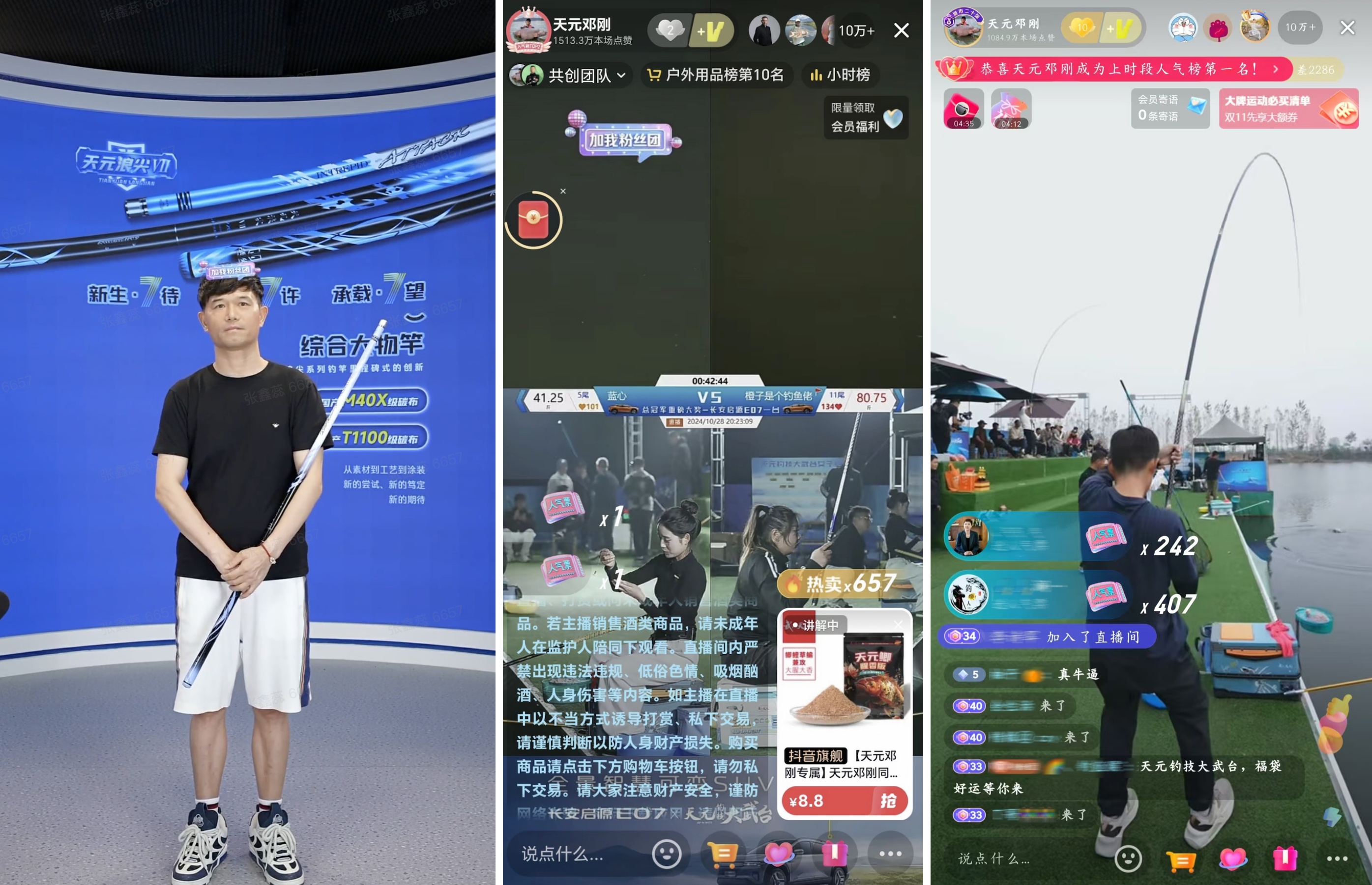 隨著用戶對(duì)于運(yùn)動(dòng)戶外的產(chǎn)品與體驗(yàn)提出了更高的要求。除了改造溝通場(chǎng)景,煥新對(duì)話內(nèi)容,運(yùn)動(dòng)戶外品牌競(jìng)爭(zhēng)的核心,更在于專業(yè)能力的比拼,即將品牌的專業(yè)能力有效轉(zhuǎn)譯,與大眾消費(fèi)需求匹配起來,讓品牌走進(jìn)大眾生活場(chǎng)景。 「在躺與卷之間,越來越多年輕人選擇了……釣魚?!箍旃?jié)奏的工作生活下,你會(huì)發(fā)現(xiàn),身邊越來越多人入了釣魚的「坑」,抖音上 #春天的快樂是釣魚給的 話題視頻播放量超 22 億,年輕人熱衷于觀看釣魚大佬的技術(shù)分享,也被激發(fā)下場(chǎng),從學(xué)技術(shù)到氪裝備,親自感受釣魚的快樂。隨著入坑的年輕人占比越來越高,釣魚裝備也逐漸向年輕化、時(shí)尚化轉(zhuǎn)變。 釣魚主播@天元鄧剛,因其驚人的釣技,是不少年輕人心中的「釣王」,他和背后漁具品牌武漢天元也充分發(fā)揮專業(yè)優(yōu)勢(shì),從「教學(xué)式」直播內(nèi)容入手,打造不叫賣的專業(yè)講解型直播間,從分享選竿方式到展現(xiàn)釣魚技巧,以專業(yè)講解,直擊釣魚愛好者的興趣點(diǎn)與需求點(diǎn)。 著眼于用戶的核心裝備剛需以及情緒需求做直播,品牌不時(shí)還打造天元釣技大武臺(tái),現(xiàn)場(chǎng)直播釣魚比賽等競(jìng)技內(nèi)容,讓用戶的臨場(chǎng)體驗(yàn)感拉滿。據(jù)了解,武漢天元的直播間內(nèi)容流量占比高達(dá) 66%,也因此,用戶粘性及互動(dòng)頻率極高。