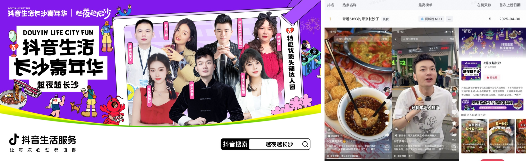 長沙的夜,藏在夜市蒸騰的煙火里,也印在老街斑駁的磚瓦中。這個(gè)春夏,「抖音生活長沙嘉年華-越夜越長沙」特邀本土美食達(dá)人和文旅博主組成“夜長沙體驗(yàn)官”,用真實(shí)體驗(yàn)帶大家重新定義夜生活——美食博主發(fā)起“24小時(shí)吃遍長沙”特種兵極限挑戰(zhàn),全程直播打卡記錄“辣度爆表”的夜市味蕾狂歡,助推五一熱點(diǎn)#帶著512G的胃來長沙了 登陸同城榜TOP1,還有#湘菜拌飯有多好吃 #在瀏陽拍到了人生煙花 兩個(gè)熱點(diǎn)均登上同城熱榜,端午期間將上線#長沙端午的含金量 ,擬邀多位高粉達(dá)人圍繞熱門特色菜、地方菜、酒吧、酒店等放大品類熱度,提升本地消費(fèi),為創(chuàng)作者和商家提供流量激勵(lì)。