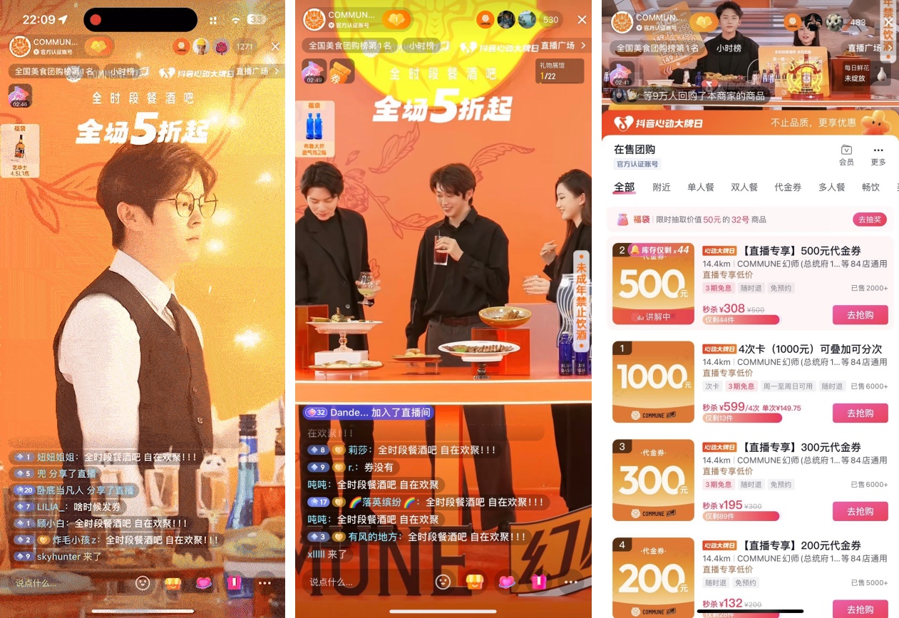 在直播間炫酷觀展、感受光影的觥籌交錯(cuò),是種怎樣的超絕體驗(yàn)?COMMUNE利用抖音直播效果打造了一場(chǎng)光影藝術(shù)展年度直播“大事件”,借助LED科技與光影藝術(shù),營造出從凌晨至深夜各個(gè)時(shí)段沉浸式氛圍與時(shí)空穿越的奇妙感受,整體的場(chǎng)景搭建視覺張力滿分。另外,直播間爆品福利也依舊亮眼吸睛,不僅為大家推出了低至六折的100、200、500等多面額代金券和次卡優(yōu)惠,更有招牌披薩、德式脆皮豬肘爆品、雞尾酒、人氣必喝特飲等單品以及新品雙人、多人好吃套餐、暢享生啤套餐等,針對(duì)性地滿足了不同人群的多場(chǎng)景消費(fèi)需求,直播間內(nèi)還隨機(jī)降落每桌必點(diǎn)招牌單品和小酒桶的秒殺及免單券……這種有趣且有料的直播模式,共同助推COMMUNE直播間最終GMV突破千萬大關(guān),創(chuàng)下了抖音生活服務(wù)異國菜品類單日直播的交易峰值。