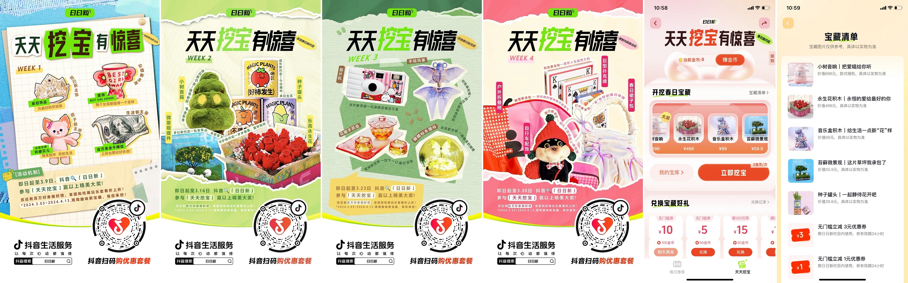 為強化用戶粘性,欄目為用戶提供每周吃喝玩樂新體驗的同時,還推出了福利互動玩法「天天挖寶」,為用戶春日生活注入新鮮感?;顒右源喝諔?yīng)季主題為設(shè)計內(nèi)核,如“3·8婦女節(jié)”“植樹節(jié)”等,為用戶提供契合每周主題的限定新奇禮品與優(yōu)惠,用戶通過完成任務(wù)即可獲取抽獎挖寶資格,贏取每周限定主題獎品。活動期間,欄目聯(lián)動站內(nèi)外70+達人,以短視頻、直播等形式傳播春日消費場景,擴大活動聲量,以讓更多用戶通過「日日新」活動獲取每周大牌優(yōu)惠消費體驗,并通過搜索參與天天挖寶給生活帶來新驚喜。