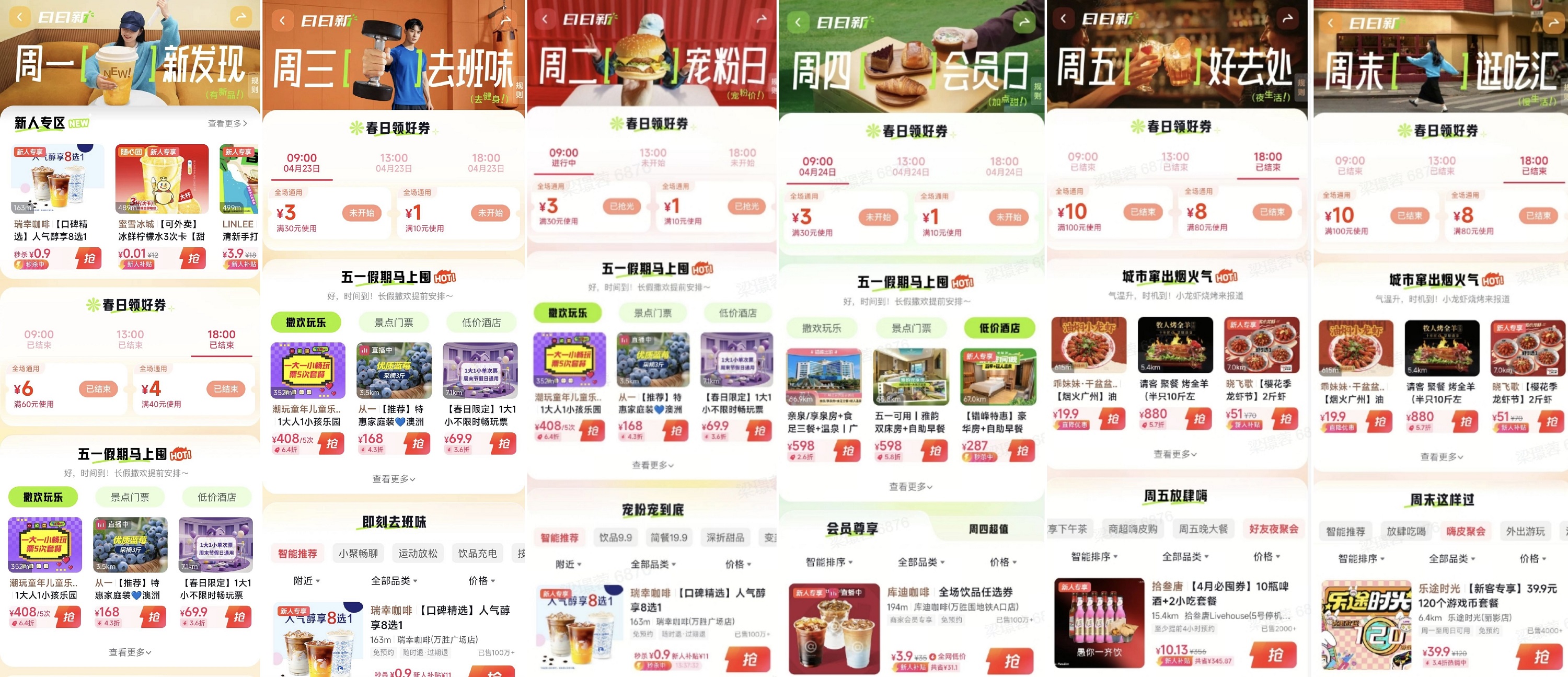 「日日新」以用戶需求為錨點,將一周劃分為不同主題場景,提供“消費攻略+福利好品”的精準方案。例如,周一聚焦“新發(fā)現(xiàn)”,聯(lián)合餐飲大牌推出“1分錢嘗鮮”活動,讓用戶低門檻體驗新品;周五則以“好去處”為主題,推薦短途周邊游、親子樂園等輕量級消費場景,搭配限時優(yōu)惠券,為周末出行提供靈感;周末則化身“逛吃匯”,整合農(nóng)家樂采摘、露營套餐、主題餐廳等場景化商品,讓用戶一鍵解鎖“周末儀式感”。