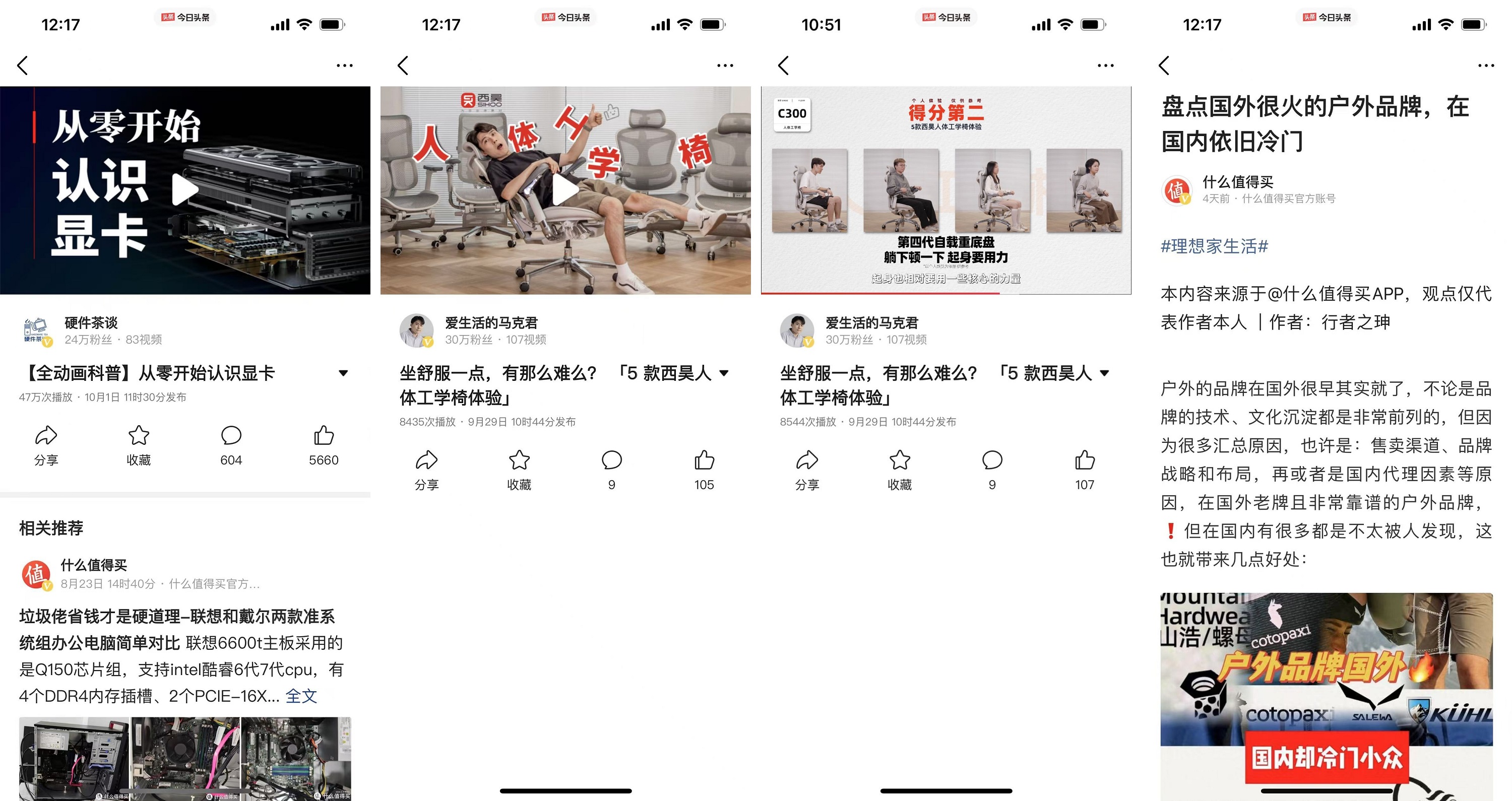 不少專業(yè)領(lǐng)域今日頭條創(chuàng)作者也紛紛打造深度內(nèi)容,分享各類產(chǎn)品選購的科普和干貨性內(nèi)容,為用戶種草消費(fèi)提供實(shí)用指南。數(shù)碼領(lǐng)域創(chuàng)作者@硬件茶談打造的“從零開始認(rèn)識(shí)顯卡”從顯卡的結(jié)構(gòu)和工作原理為用戶科普在選購電腦時(shí)需要關(guān)注的顯卡性能和型號(hào)。關(guān)注生活體驗(yàn)的創(chuàng)作者@愛生活的馬克君打造的“人體工學(xué)椅體驗(yàn)”深度視頻,測(cè)評(píng)5款人體工學(xué)椅,從頭枕調(diào)節(jié),腰靠分區(qū)、扶手調(diào)節(jié)、底座材質(zhì)等多維度親身體驗(yàn)不同款式人體工學(xué)椅,讓用戶了解每款產(chǎn)品的區(qū)別。消費(fèi)類創(chuàng)作者@什么值得買打造的“盤點(diǎn)國外很火的戶外品牌,在國內(nèi)依舊冷門”等內(nèi)容,為消費(fèi)者提供了戶外穿搭和選購參考。眾多今日頭條創(chuàng)作者以生動(dòng)、形象的內(nèi)容講解和親身體驗(yàn),為用戶進(jìn)行知識(shí)科普,讓消費(fèi)者在選購商品時(shí)更加理性。