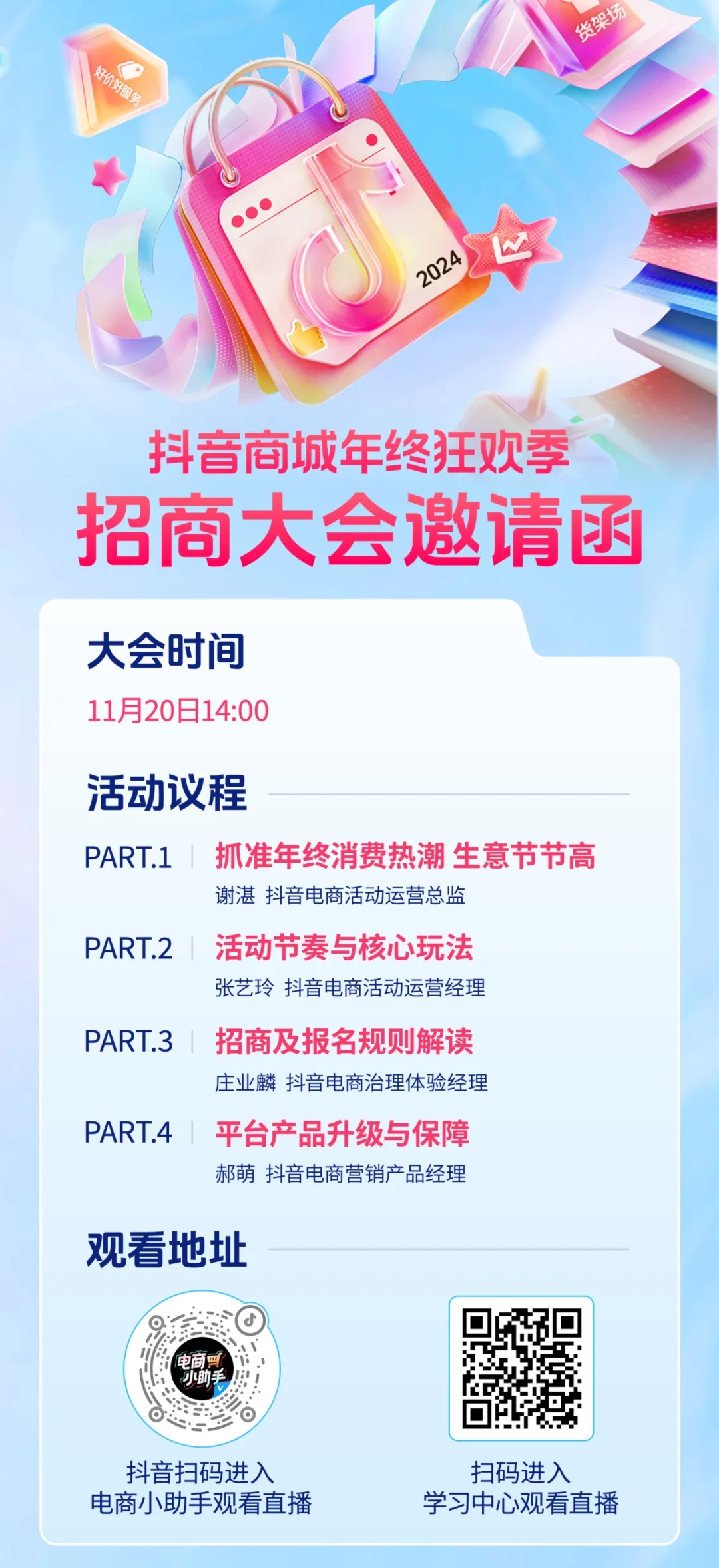 為助力商家把握年終大促的節(jié)點機遇,實現(xiàn)新一輪的生意增長目標。11月20日下午2點,「抖音商城年終狂歡季」招商大會正式啟動。大會期間,抖音電商相關業(yè)務負責人將對活動節(jié)奏、核心玩法、供給策略、招商及報名規(guī)則、平臺產品升級與保障等一系列干貨信息進行詳細解讀,助力商家、創(chuàng)作者等合作伙伴高效破解營銷難題,沖刺生意爆發(fā)!
