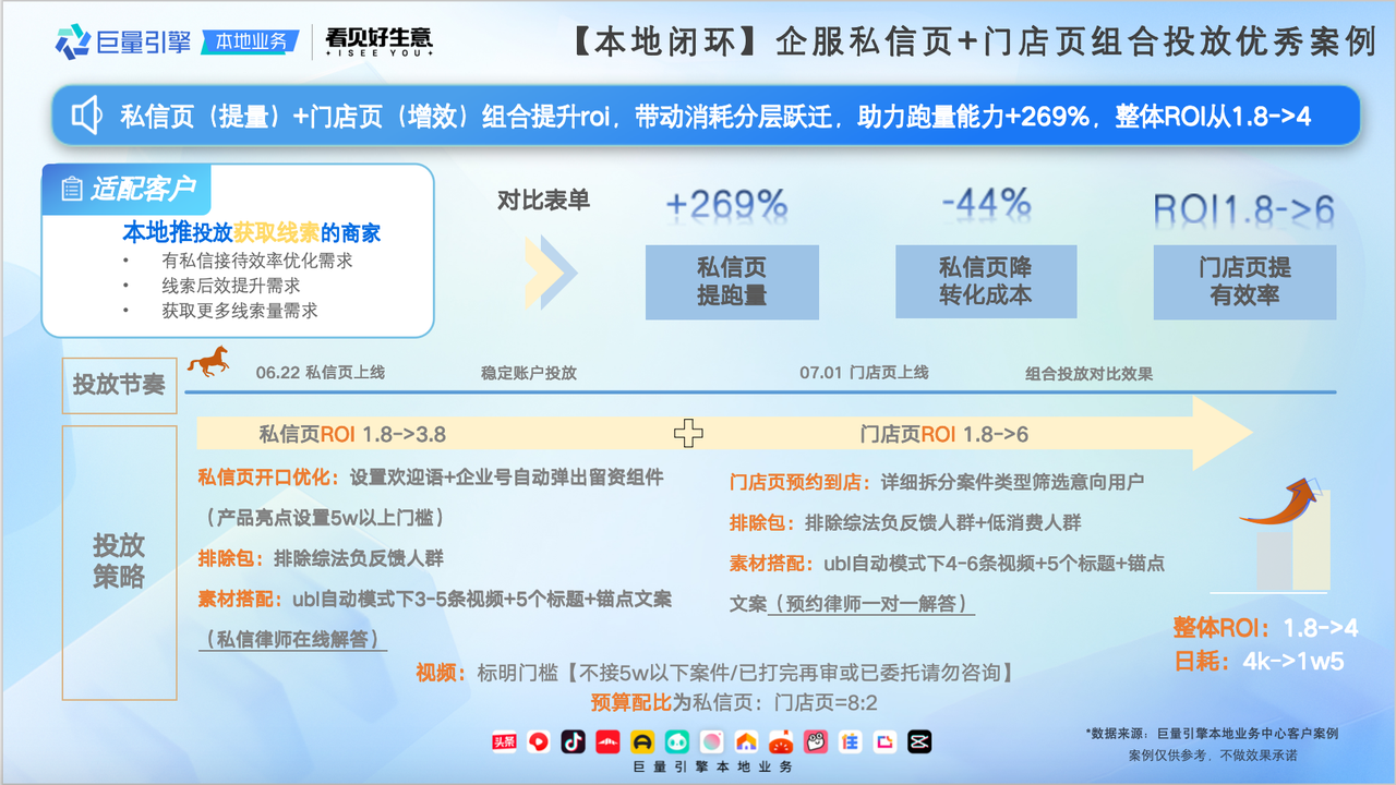 作為律所企業(yè),商家采用“私信頁(提量)+門店頁(增效)”的組合式打法,私信頁設置歡迎語,企業(yè)號自動彈出留資組件。同時,用門店頁掛載細分案件類型篩選意向客戶,用排除包排除綜法負反饋人群+低消費人群,并進行素材搭配。日消耗增長3倍,從4K增長至1W5,整整躍升3倍!整體ROI更從1.8增長至4!
