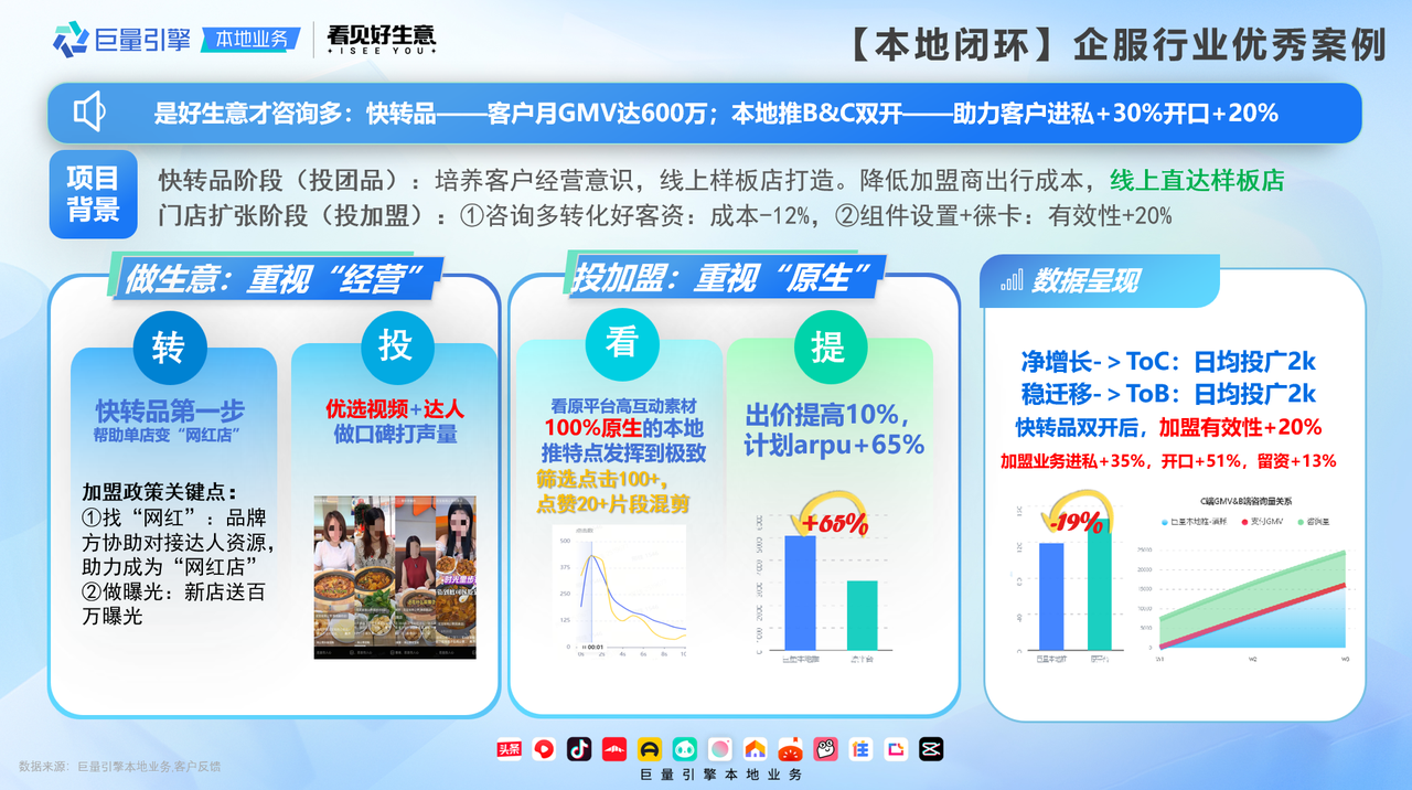 數(shù)據(jù)呈現(xiàn)驗證了策略與模式的正確性,快轉品雙開后,加盟有效性提升超20%,加盟業(yè)務私信上漲超35%,留資增長13%。