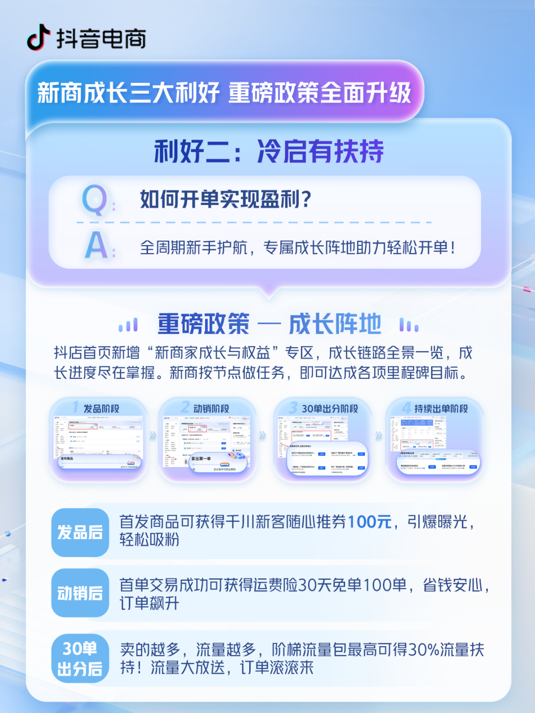 抖音電商不但首次公開(kāi)了新商專(zhuān)屬階梯流量加速包,而且還全新上線了“新商家成長(zhǎng)與權(quán)益”專(zhuān)區(qū)。