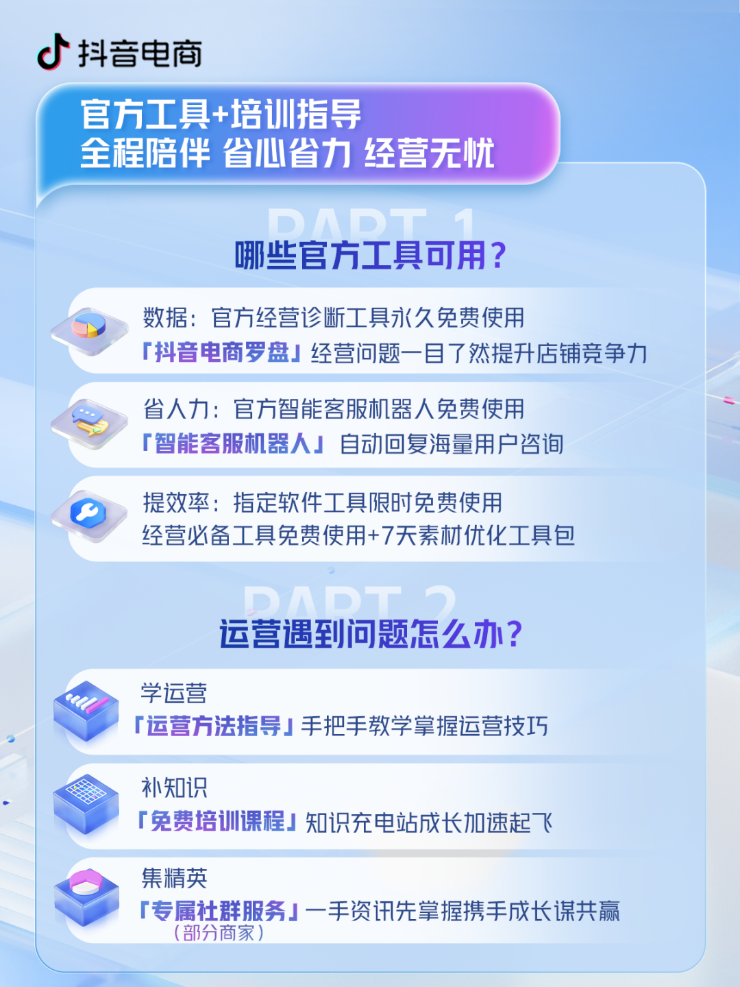 除此以外,抖音電商還為新商家提供了運(yùn)營(yíng)方法指導(dǎo)和免費(fèi)培訓(xùn)課程,甚至有機(jī)會(huì)獲得專(zhuān)屬社群服務(wù)等等權(quán)益。