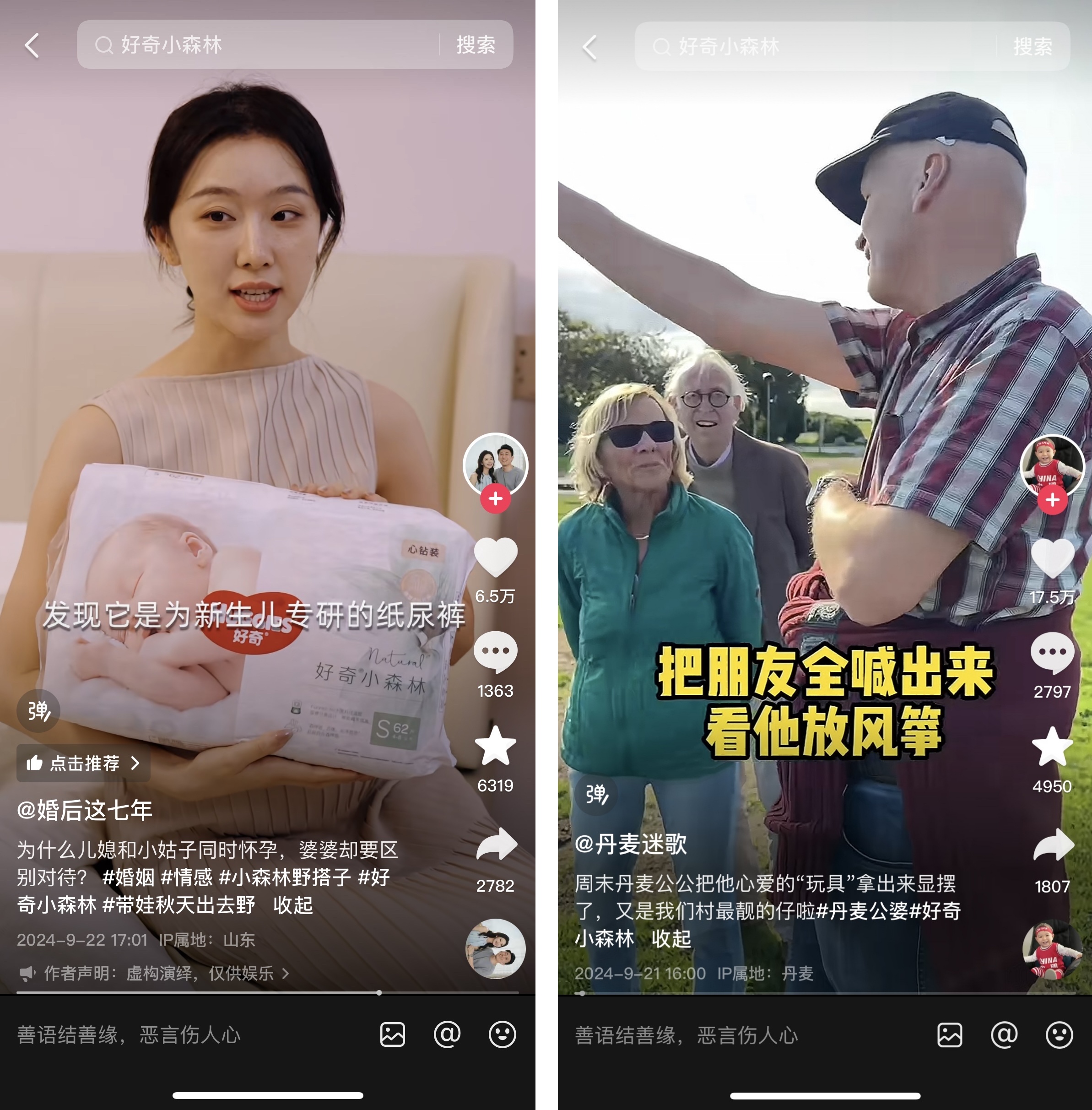 活動(dòng)期間,#帶娃秋天出去野 話題熱度居高不下,聚合各類創(chuàng)作者持續(xù)輸出“秋日親子出行生活新方式”。其中,劇情博主@婚后這七年 以用戶關(guān)注的婆媳問題為切入點(diǎn),講述婆婆是婚姻最好的加油站的故事。親子博主@丹麥迷歌 則分享了生活中朋友戶外相聚的溫馨瞬間。@趙肉絲cici、@王豆豆愛逗逗兒 等諸多不同賽道的寶藏創(chuàng)作者也輪番開啟花式分享,巧妙地將好奇小森林去野系列紙尿褲融入其中,將透氣散熱、干爽不粘、柔軟親膚的產(chǎn)品特點(diǎn)展示出來,大大提升了話題的內(nèi)容質(zhì)量以及品牌的熱度,實(shí)現(xiàn)對(duì)產(chǎn)品的深度種草。