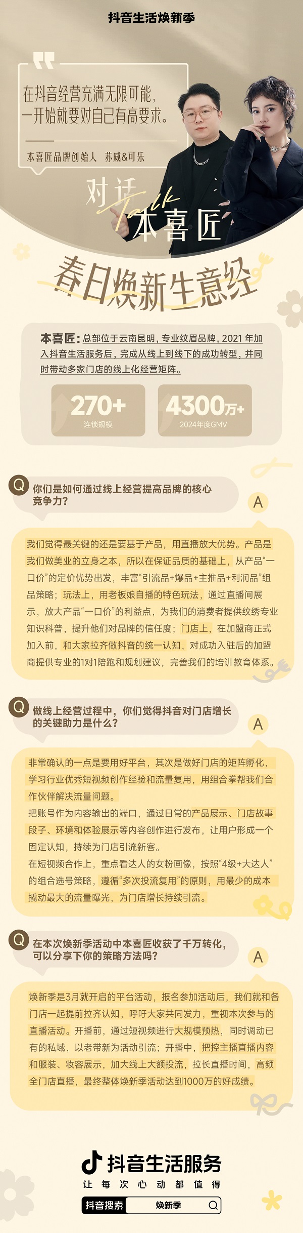 從用戶的問題里看到痛點(diǎn)和機(jī)會,把傳統(tǒng)紋眉的“店等人”轉(zhuǎn)向“人找店”,在有品類無品牌的紋繡行業(yè)做出全國連鎖......本喜匠一次次用“反常識”在抖音踏出了增長之路,「抖音生活煥新季」期間,單月支付突破了1000萬元。
