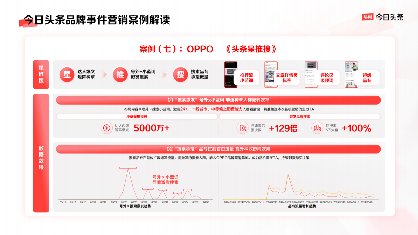 如OPPO新機(jī)上線。今日頭條配合品牌布局頭條星推搜,針對(duì)性觸達(dá)24+、一線城市、中等偏上消費(fèi)能力人群,激發(fā)其看后搜動(dòng)作。通過(guò)達(dá)人爆文矩陣種草、號(hào)外+小藍(lán)詞激發(fā)搜索、搜索品專承接流量,層層遞進(jìn),協(xié)助OPPO新機(jī)獲得5000萬(wàn)+曝光,激發(fā)日均看后搜次數(shù)增長(zhǎng)129倍、回搜率對(duì)比大盤增加100%。今日頭條幫助品牌在新品上市期精準(zhǔn)觸達(dá)高潛用戶人群,搶占先機(jī)。