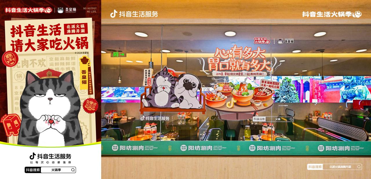 活動(dòng)期間,抖音生活火鍋季「北派火鍋」與國(guó)民IP吾皇貓聯(lián)手“搞事情”,以“心有多大,胃口就有多大”開啟了跨次元萌趣聯(lián)動(dòng)。北京陽(yáng)坊涮肉、濟(jì)南徐升記、沈陽(yáng)大吉利、南京王和李海鮮火鍋大排檔4位S級(jí)商家,通過(guò)與吾皇貓店內(nèi)互動(dòng),吸引年輕用戶充分整合線上線下資源,打造出一場(chǎng)趣味十足的火鍋新風(fēng)潮。