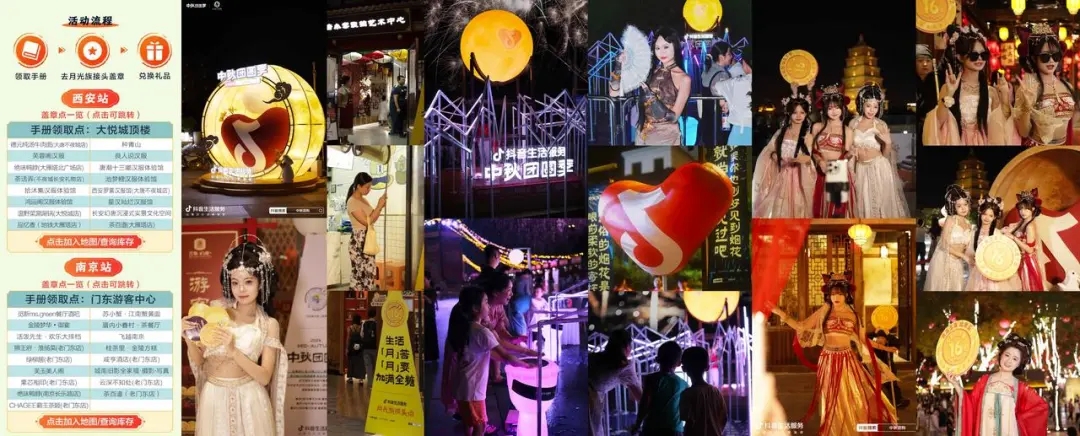 線上引發(fā)節(jié)日狂歡的同時,抖音生活服務(wù)于9月15日至9月17日三天小長假期間,在南京、西安、瀏陽三城打造創(chuàng)意十足的互動打卡活動,讓每位用戶近距離感受中秋的美好與溫暖。在南京老門東、西安大唐不夜城、瀏陽翠園公園的活動現(xiàn)場,眾多市民游客沉浸在一系列好看又好玩的打卡裝置中,共同體驗(yàn)了傳統(tǒng)佳節(jié)的別樣魅力。