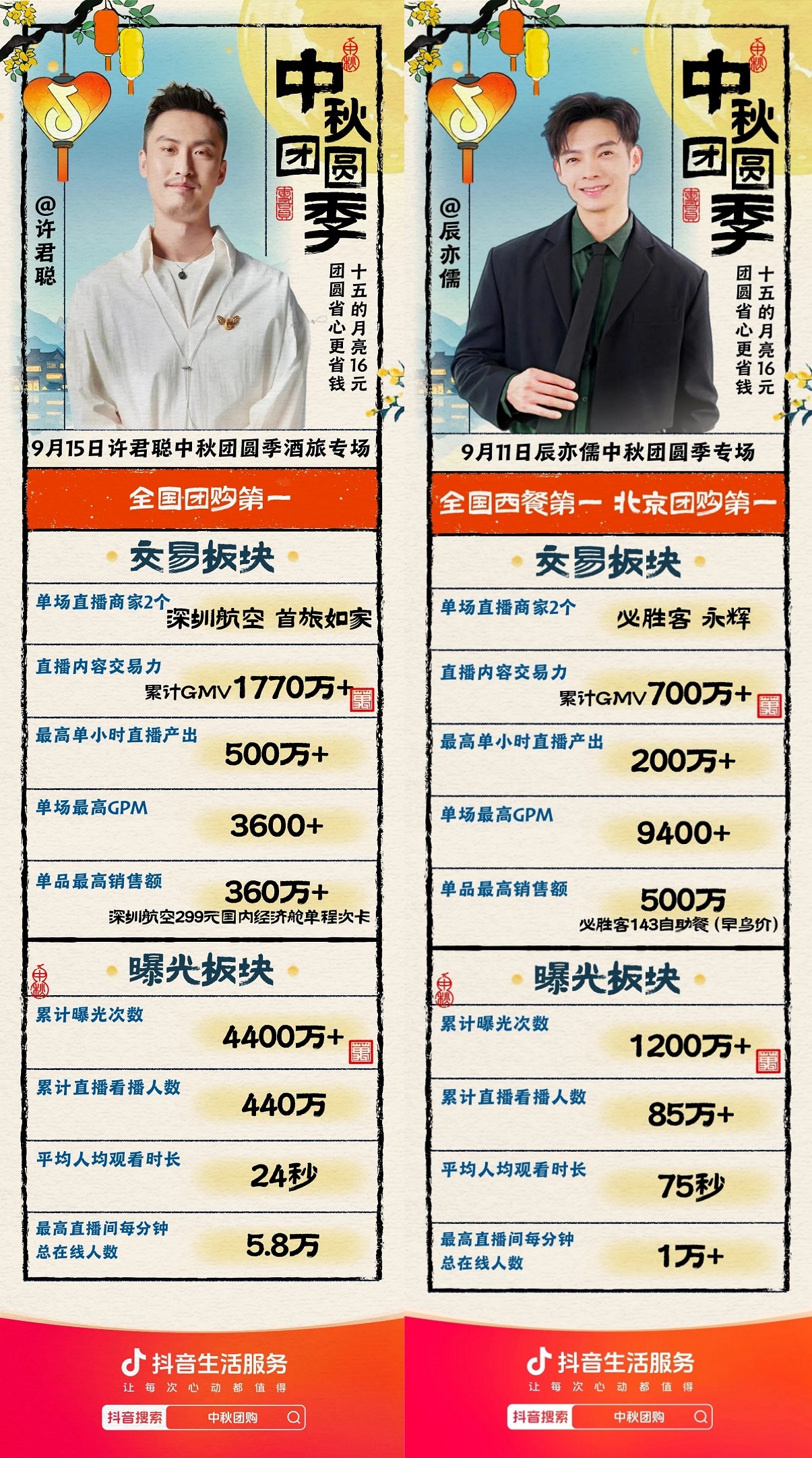 此外,活動充分調(diào)動優(yōu)勢資源,通過明星達(dá)人直播的排兵布陣,加速消費(fèi)者購買決策鏈路。抖音生活服務(wù)邀請到辰亦儒、許君聰?shù)让餍腔韴F(tuán)圓星推官,在中秋直播中帶領(lǐng)廣大用戶開啟中秋吃喝玩樂之旅。辰亦儒直播首日告捷,實(shí)現(xiàn)全國西餐第一、北京團(tuán)購第一。許君聰全國團(tuán)購榜第一,更有@華潤寶總 @華潤阿寶、@小白不白、@湯神來了、@謝佩源等達(dá)人推薦中秋好品,以優(yōu)質(zhì)內(nèi)容種草拉升品牌交易增長。
