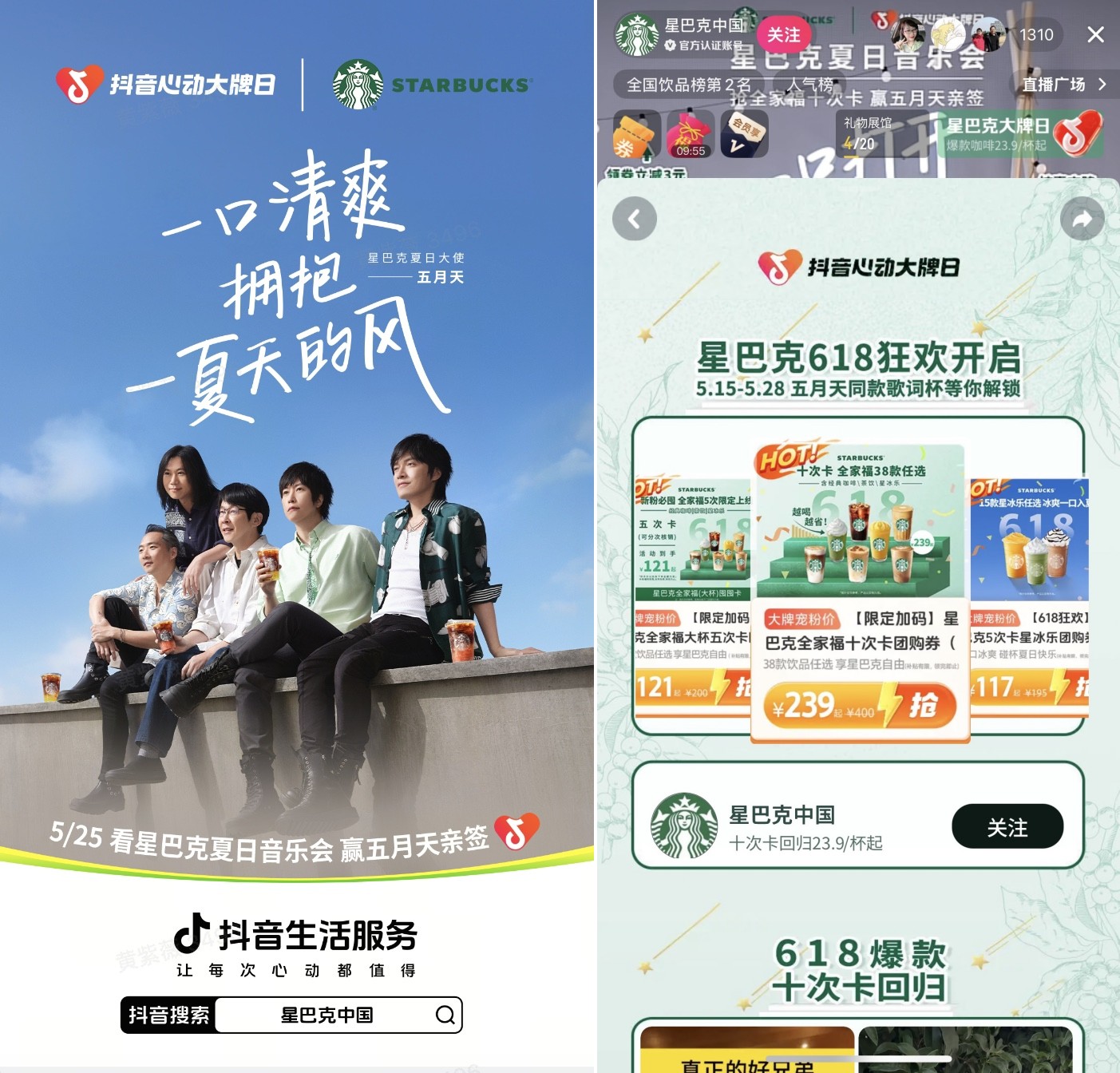 作為全球咖啡行業(yè)代表,星巴克在中國坐擁超7000家門店,品牌自創(chuàng)立以來,一直致力于為用戶打造高品質(zhì)咖啡的社交聚集地。今年五月,品牌精準(zhǔn)把握“五月天25周年”這一集體情懷爆發(fā)點(diǎn),借勢「抖音心動大牌日」IP勢能開啟特別企劃:以“咖啡+音樂”雙載體重構(gòu)消費(fèi)場景,將門店轉(zhuǎn)化為粉絲的青春記憶場域,更借抖音全域流量為“五迷”釋放獨(dú)家夏日驚喜。